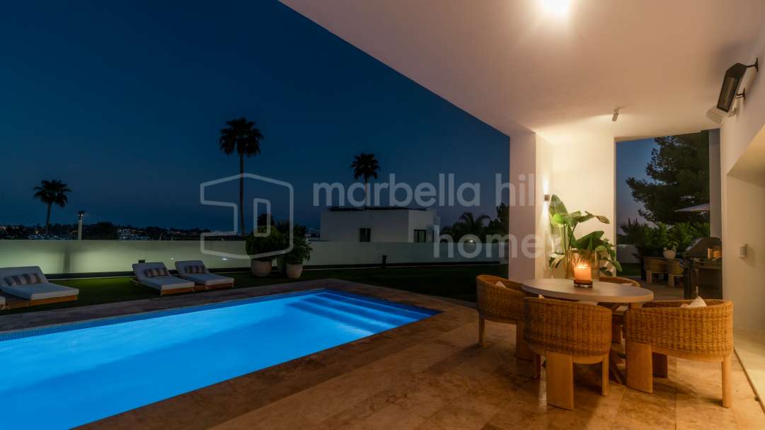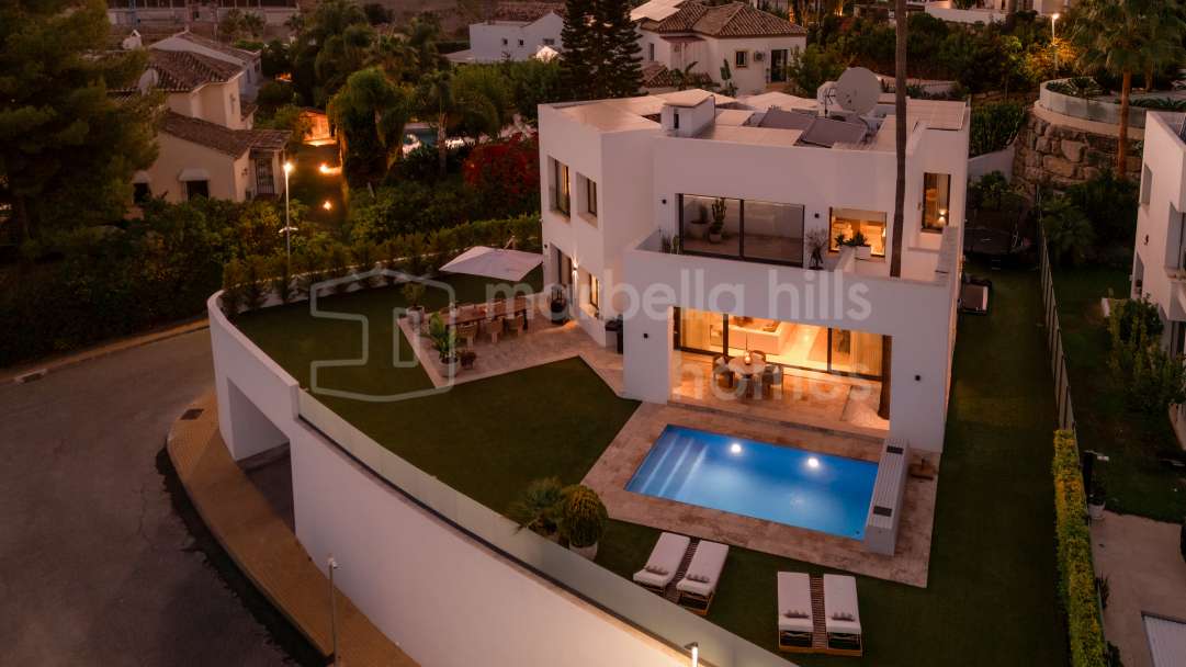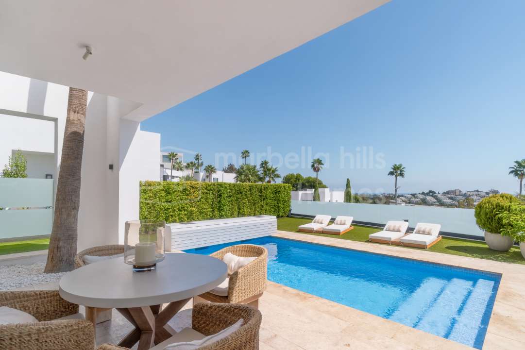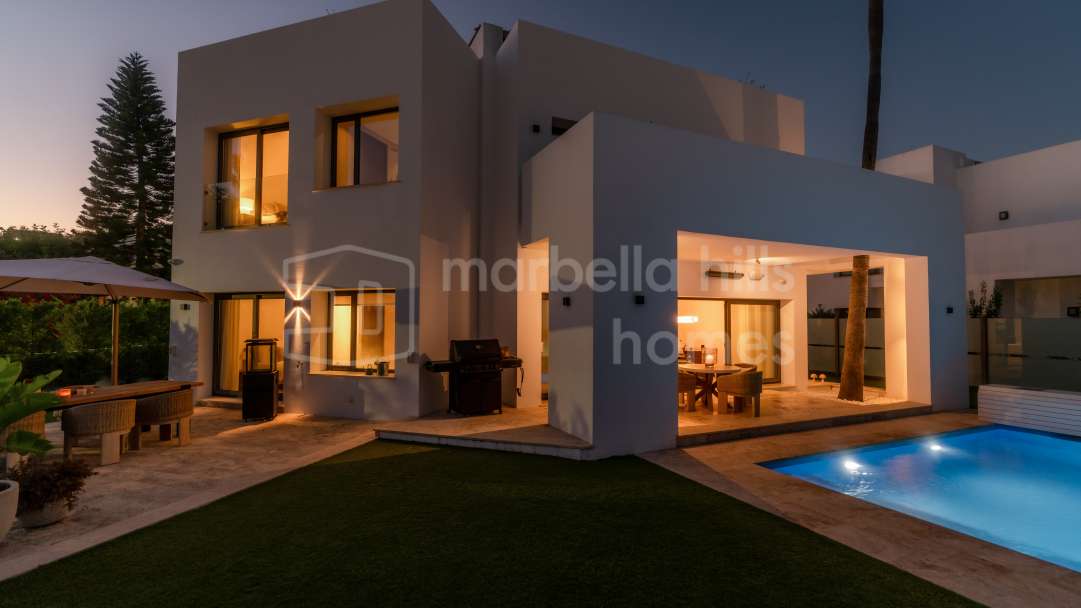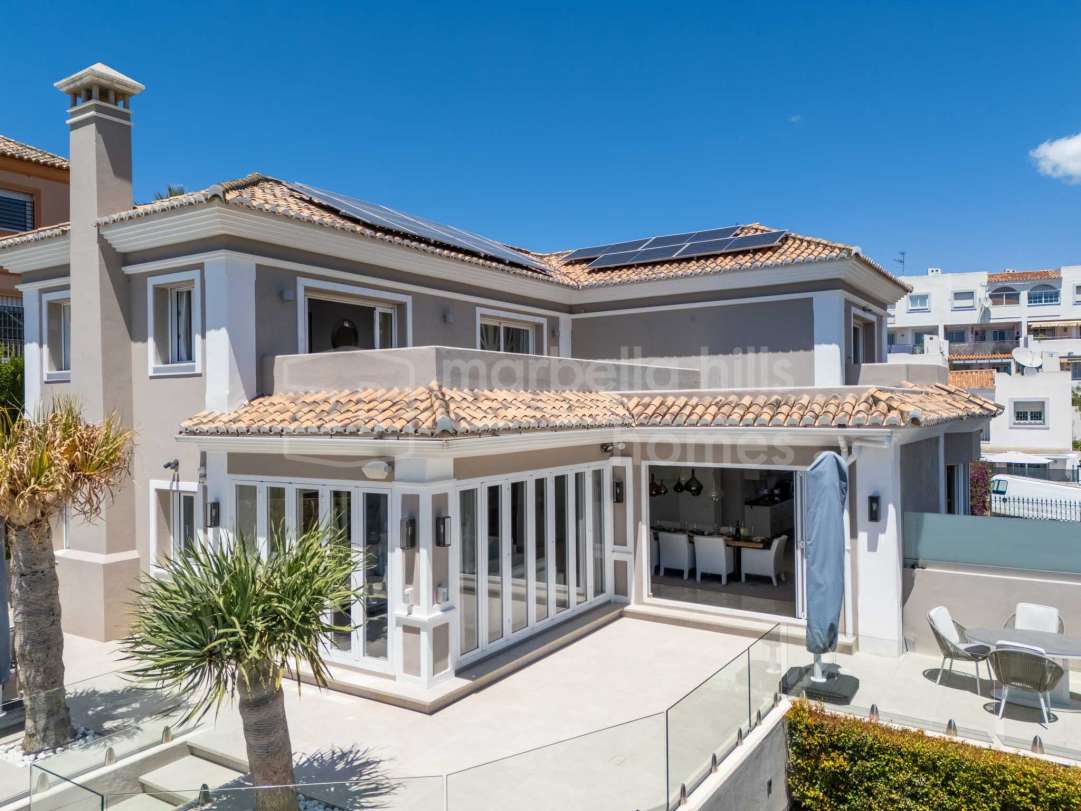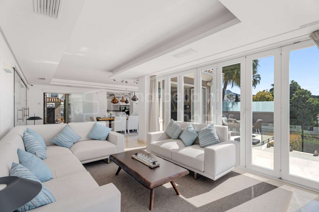 Modern semi-detached villa for sale in Altos de Salamanca, Golden Mile – refurbished, 5 bedrooms, gym, cinema, solarium and sea views.