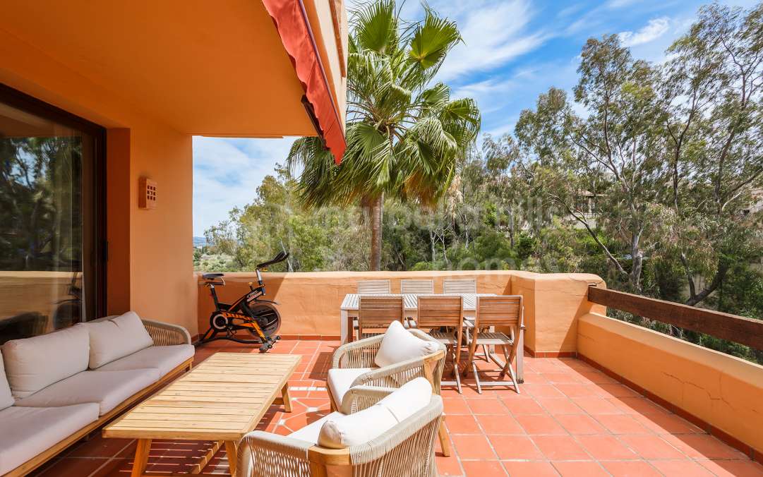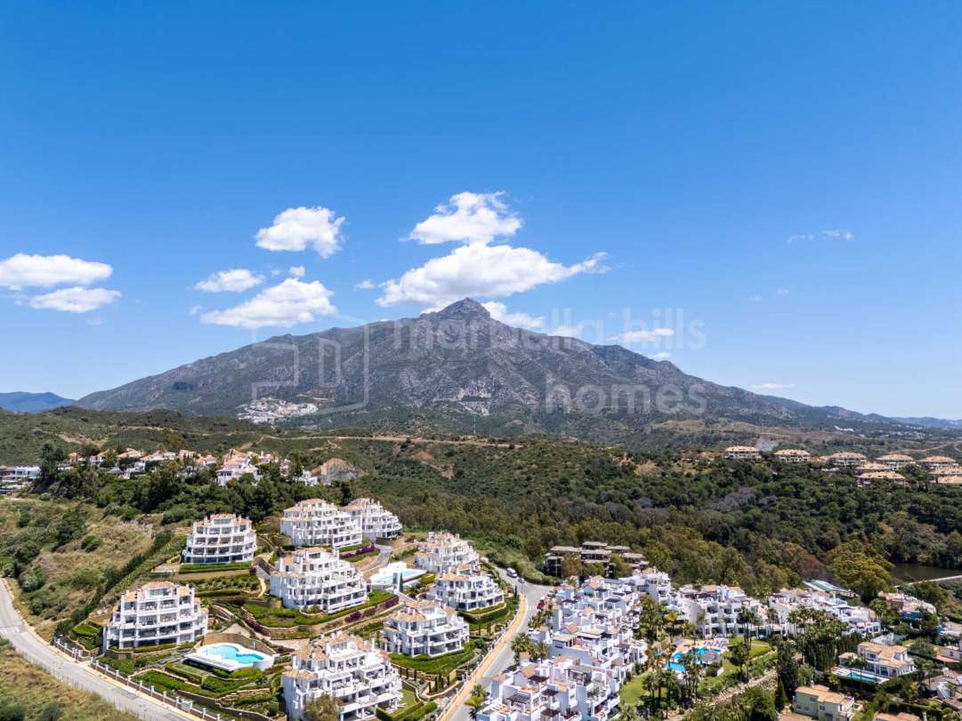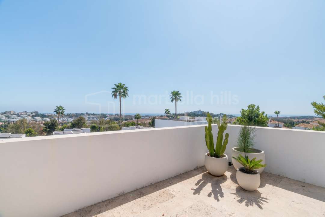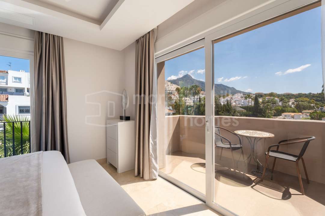 Stylishly renovated 3-bedroom, 2-bathroom duplex penthouse in Aloha Gardens, Nueva Andalucía. Features rooftop jacuzzi, BBQ area, open-plan living, mountain views and strong...