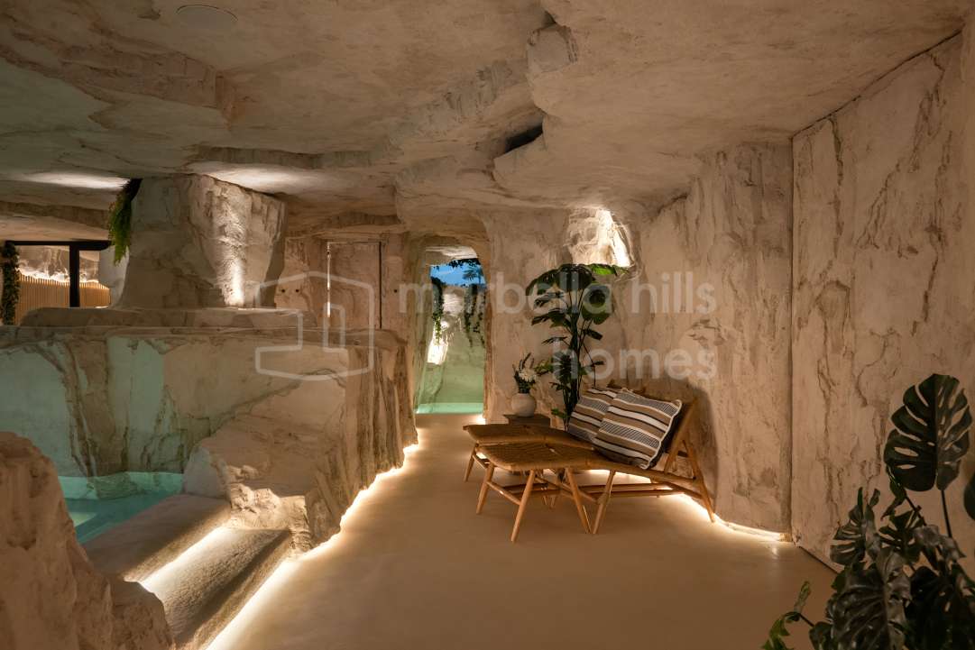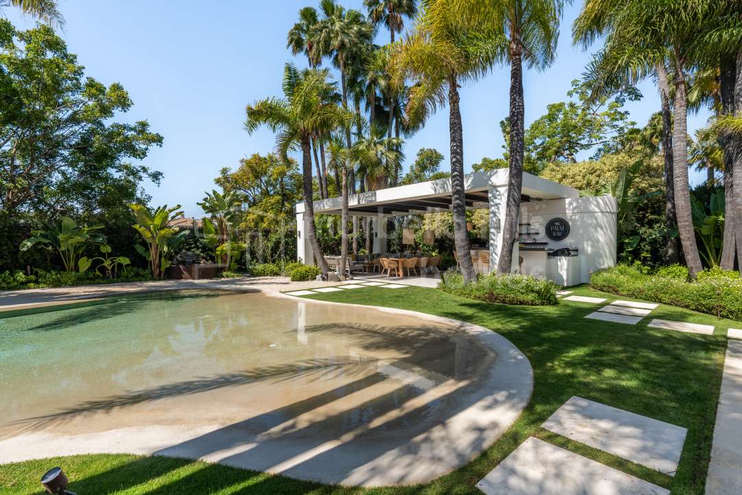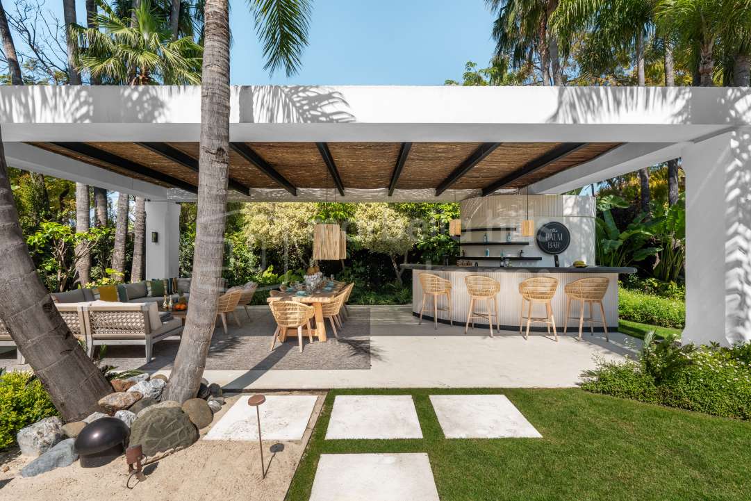 Modern six-bedroom luxury villa in Nueva Andalucía, Marbella. Contemporary design, spa and wellness area, entertainment level, tropical gardens and privacy near Puerto Banús.