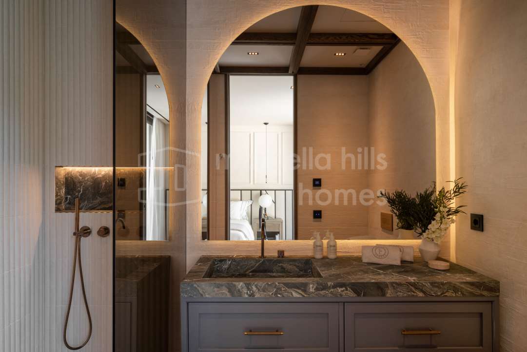 Modern luxury villa in Nueva Andalucía with 5 bedrooms, panoramic La Concha views, infinity pool, rooftop jacuzzi, elegant interiors and expansive terraces. Prime location near...