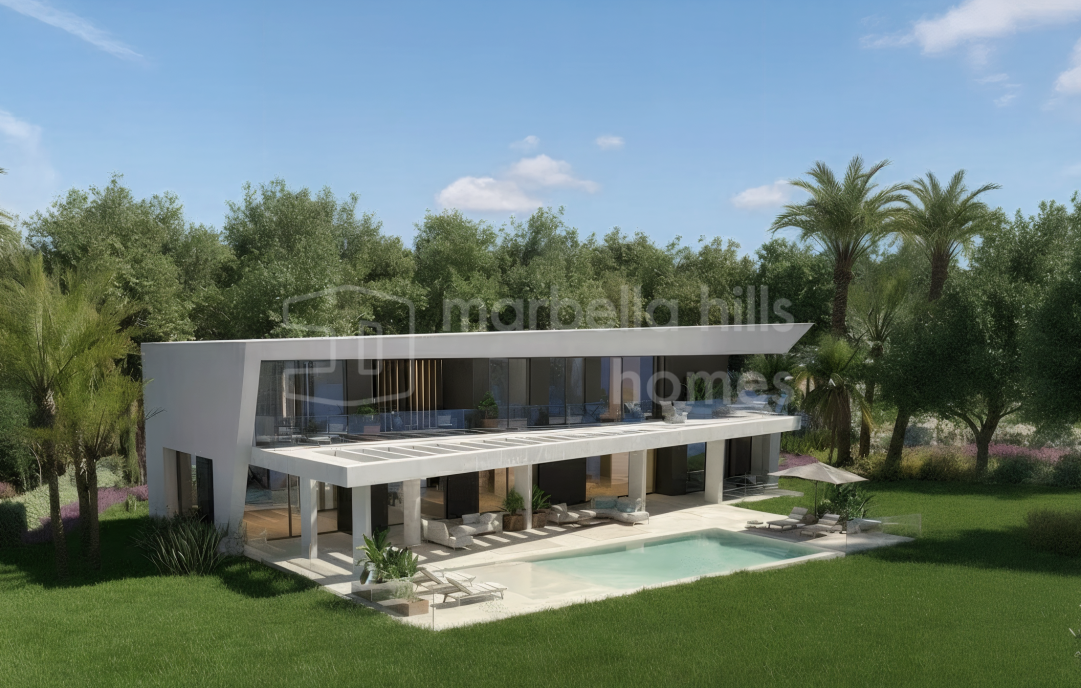 Modern off-plan luxury villa for sale in Guadalmina Baja, Marbella. Large plot, private pool, contemporary design. Building licence pending.