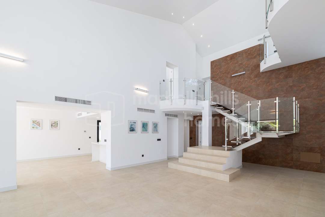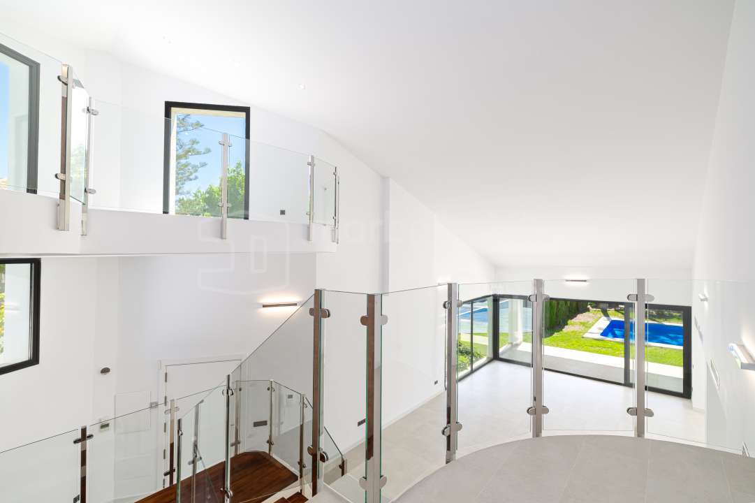 Contemporary five-bedroom villa for sale in San Pedro de Alcántara, featuring modern interiors, en-suite bedrooms, landscaped gardens, outdoor gym, terraces and a private pool...