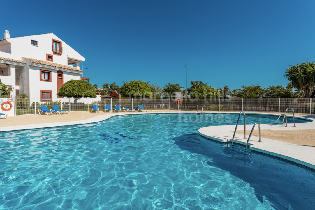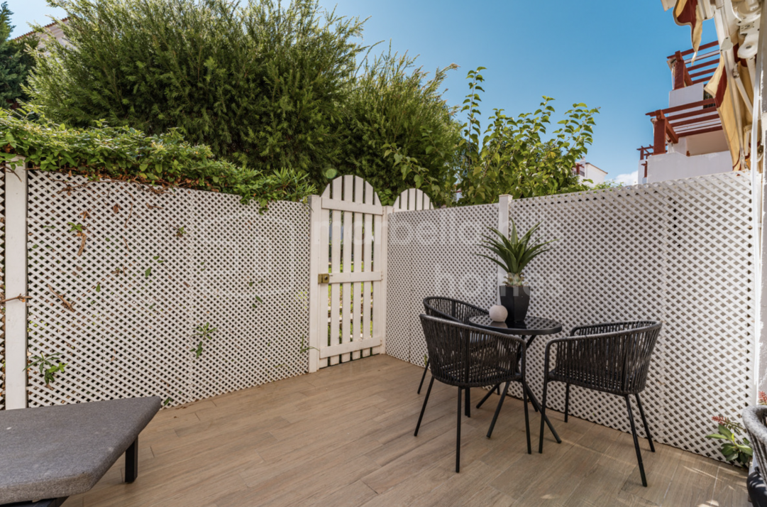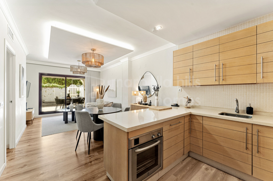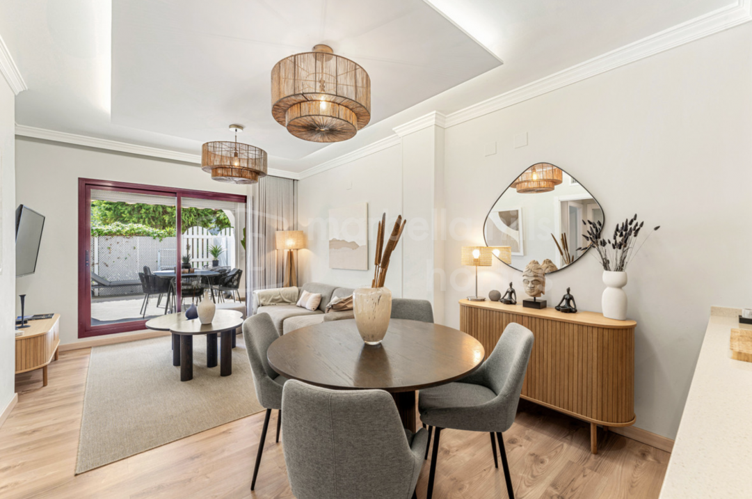 Stylish ground floor apartment just 150 metres from the beach in San Pedro de Alcántara with private terrace, garden access, communal pool and parking.