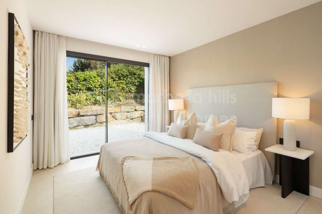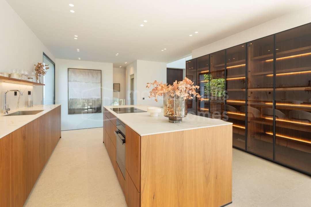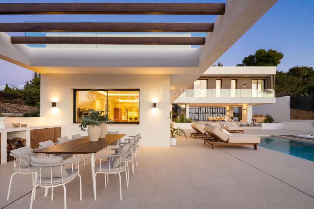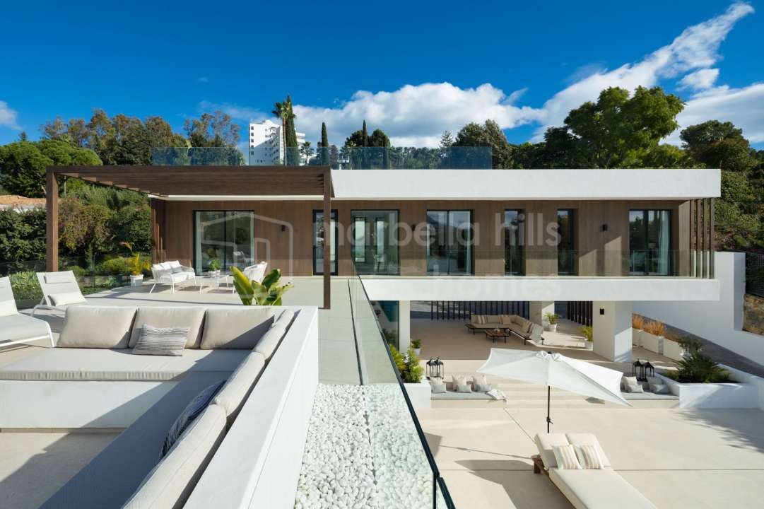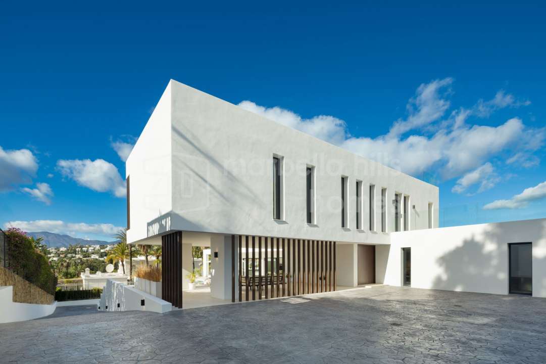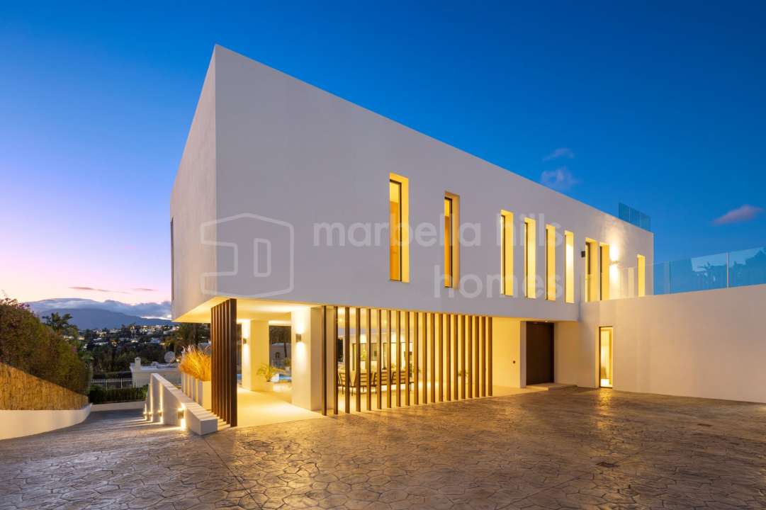 Newly built contemporary villa for sale in El Paraíso Medio, Estepona. Five en-suite bedrooms, extensive terraces, pool, gym and cinema room near Marbella and Puerto Banús.