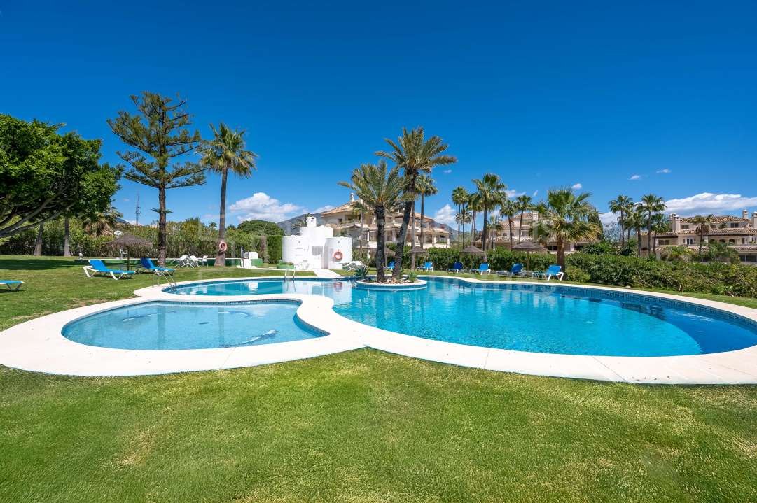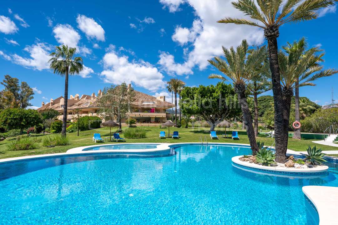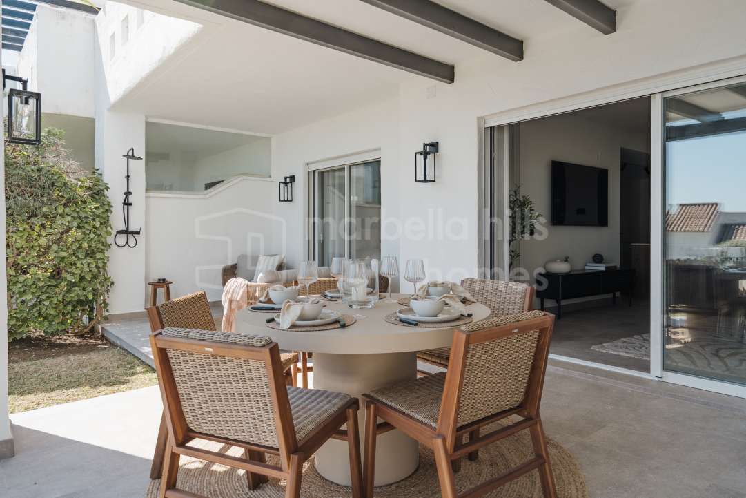 Renovated 3-bedroom apartment in La Quinta, Nueva Andalucía with private garden, terrace, sea views and gated community near Puerto Banús.