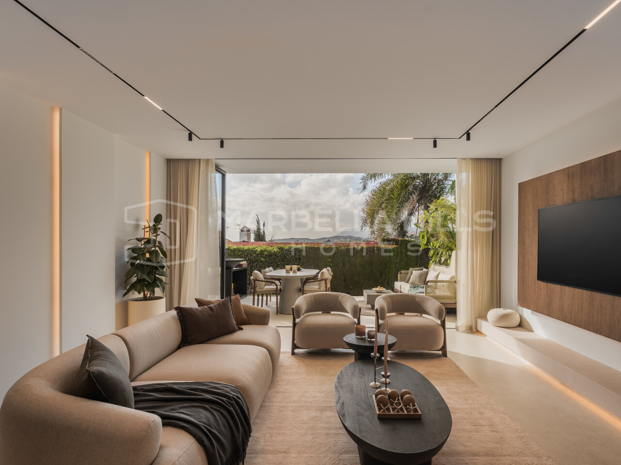 This beautifully renovated 3-bedroom, 2-bathroom townhouse is located in the prestigious gated community of Los Algarrobos in Aloha, Nueva Andalucía. Combining modern Scandinavian design with relaxed Mediterranean living, this south-facing home enjoys abundant natural light, golf frontage, and partial sea views from the upper floor.