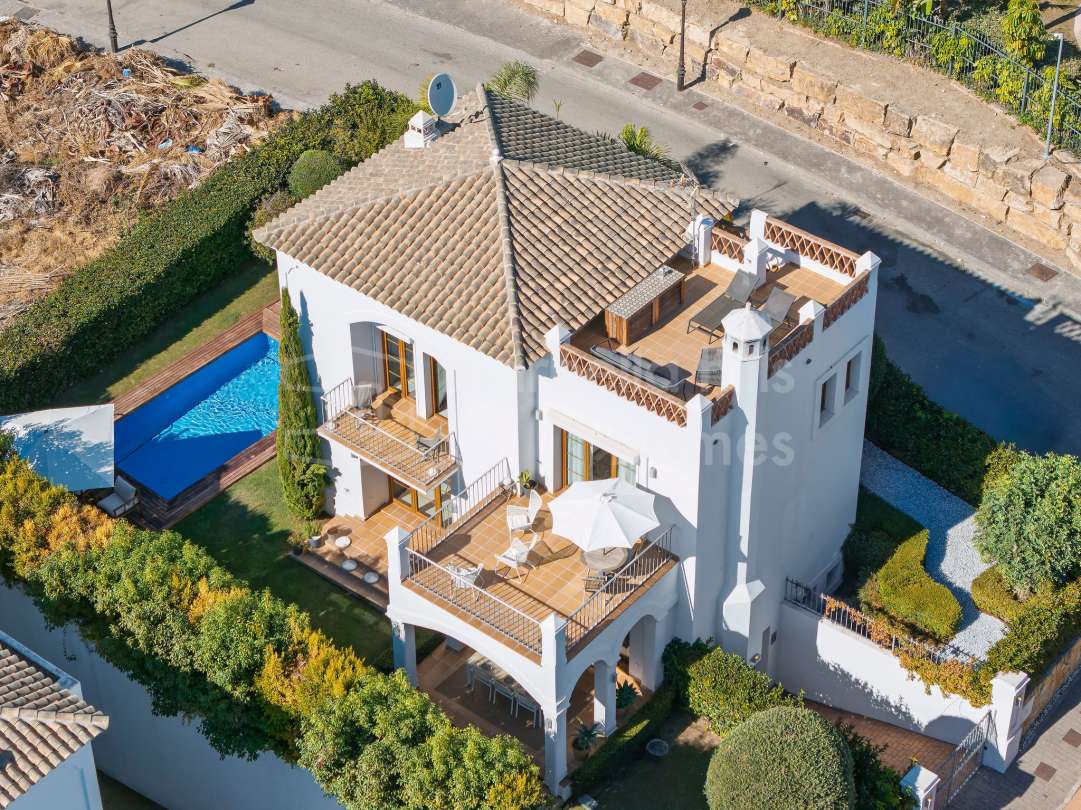 Elegant Andalusian-style villa in Buenas Noches, Estepona, with sea views, private pool, and rental potential — luxury coastal living on the Costa del Sol.