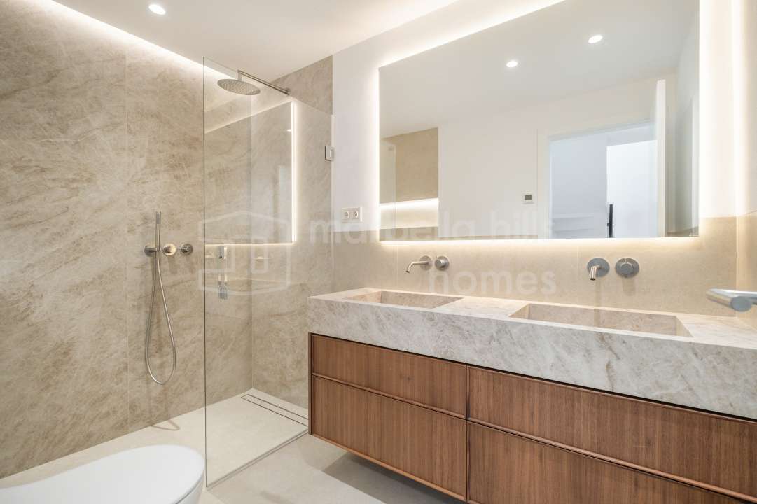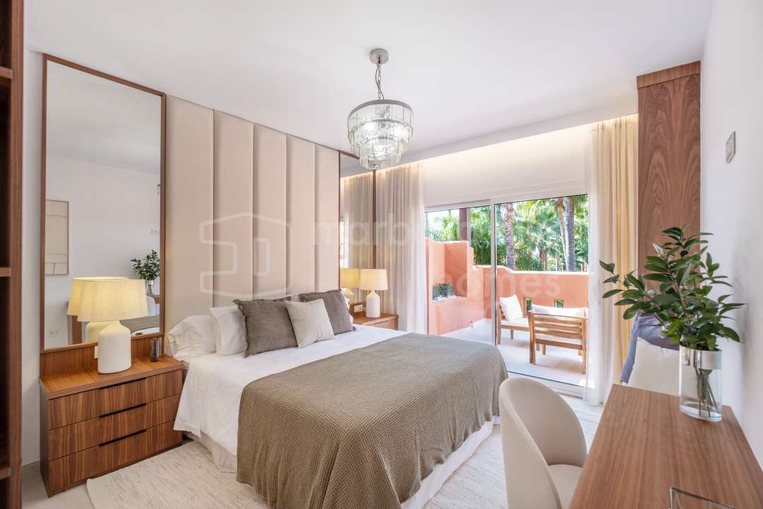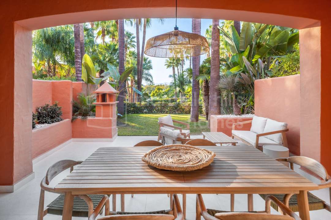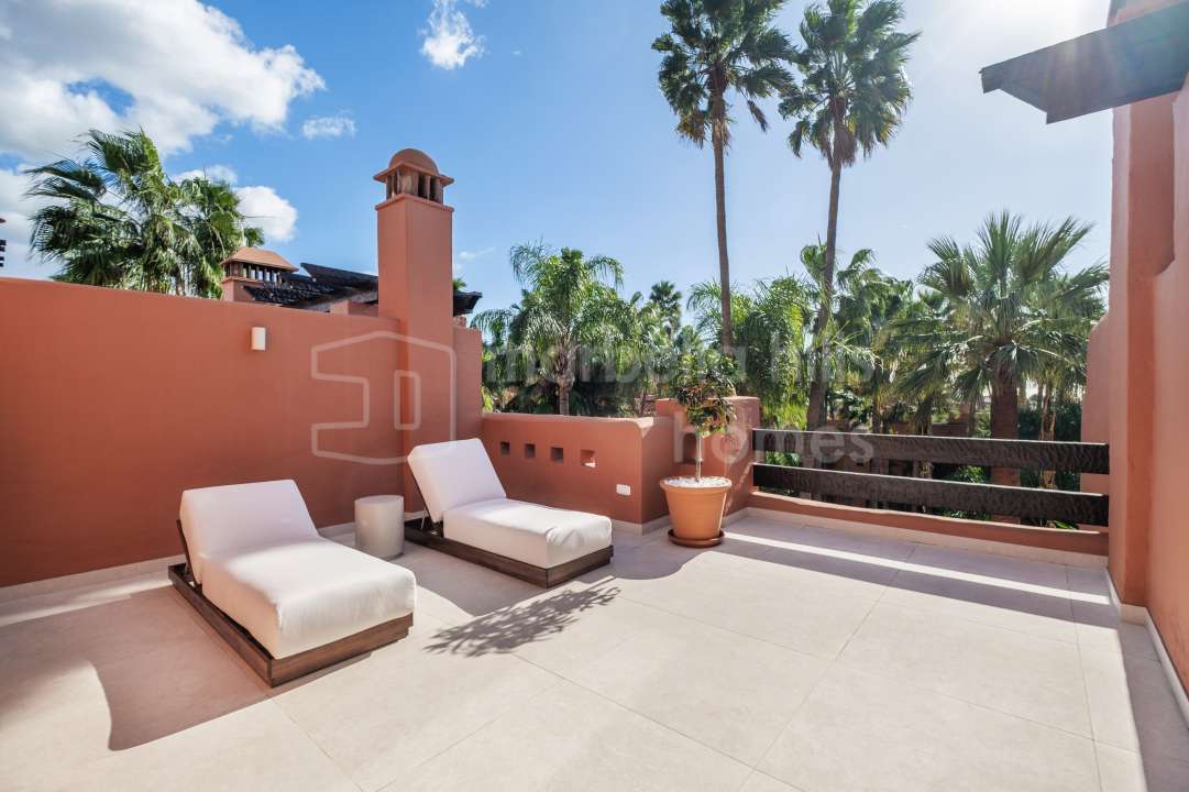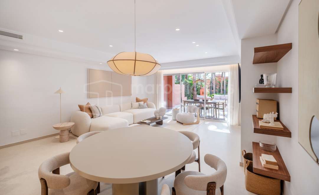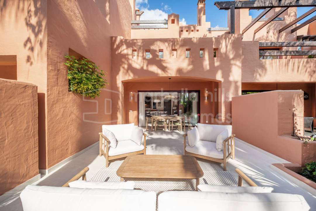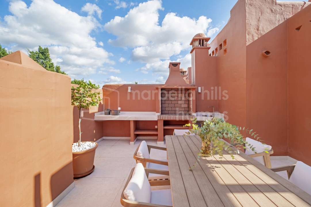 Fully renovated 4-bedroom townhouse in Altos de Puente Romano with bespoke interiors, south-facing garden, rooftop solarium, private garage and walking distance to Puente...