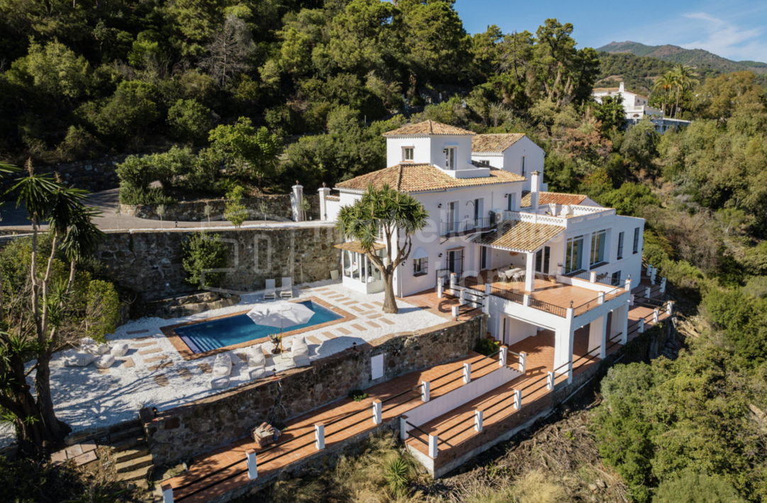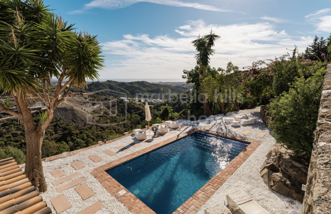 Impresionante villa de 6 dormitorios en El Madroñal, Benahavís, con 4.795 m² de parcela, vistas al mar, privacidad total, piscina, casa de invitados y estilo andaluz contemporáneo.