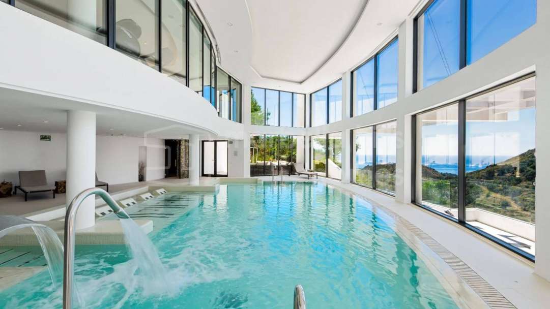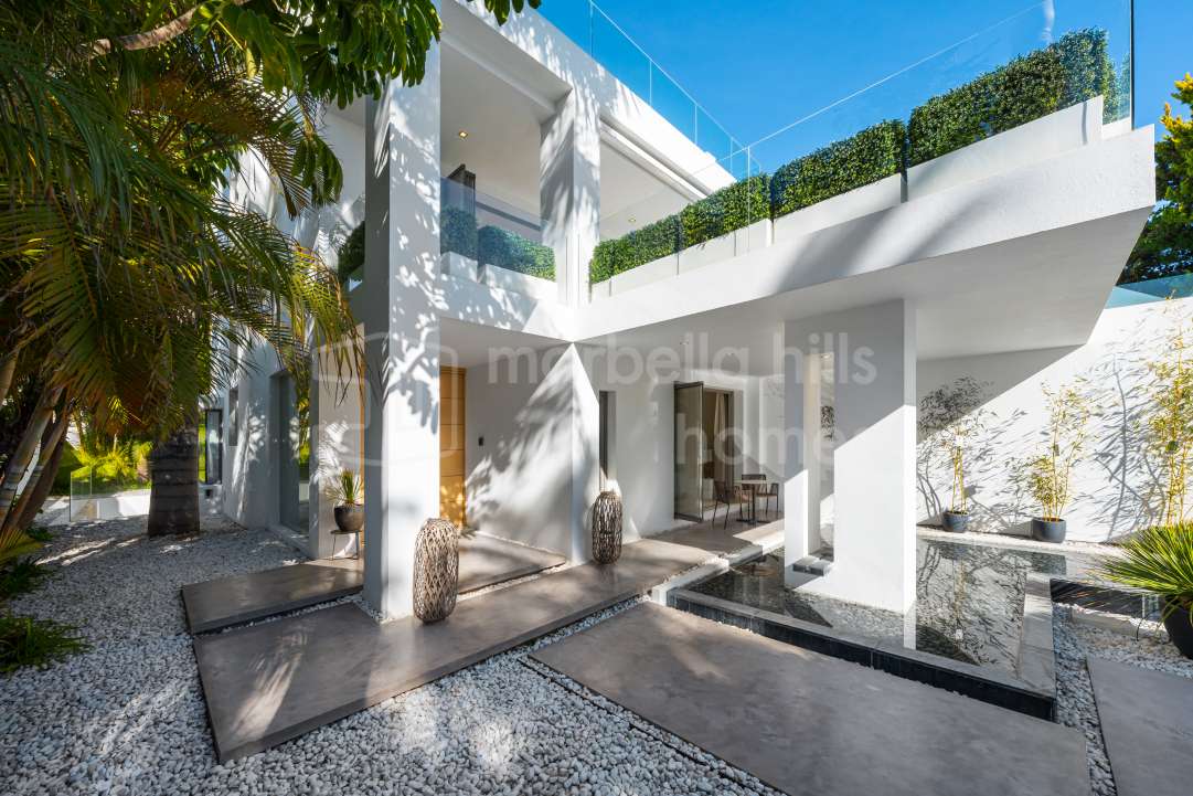 Villa contemporánea de 5 dormitorios en venta en El Rosario, Marbella Este. Vistas panorámicas al mar, parcela llana de 2.077 m², piscina privada, una sola planta y seguridad 24...
