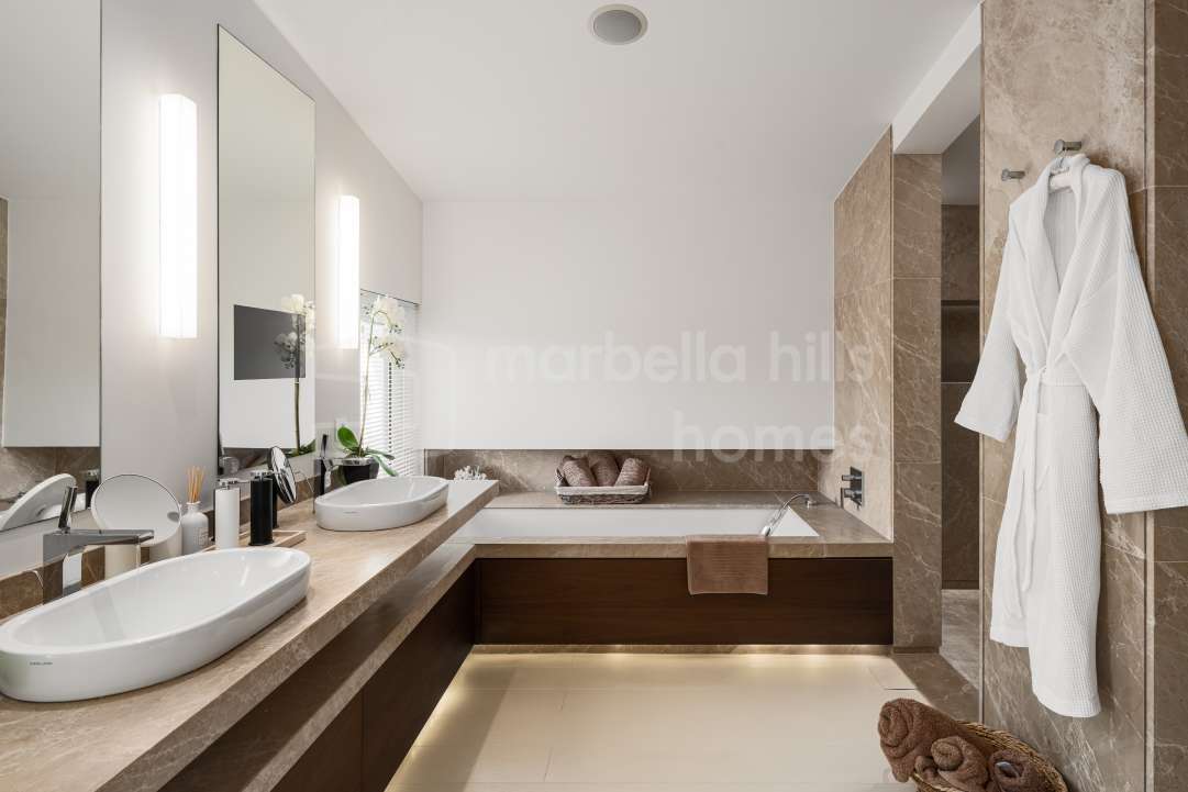 Villa moderna de 6 dormitorios en Nueva Andalucía, Marbella. 493 m² construidos, parcela de 1.443 m², piscina privada, solárium y vistas abiertas al Golf Valley. Precio...