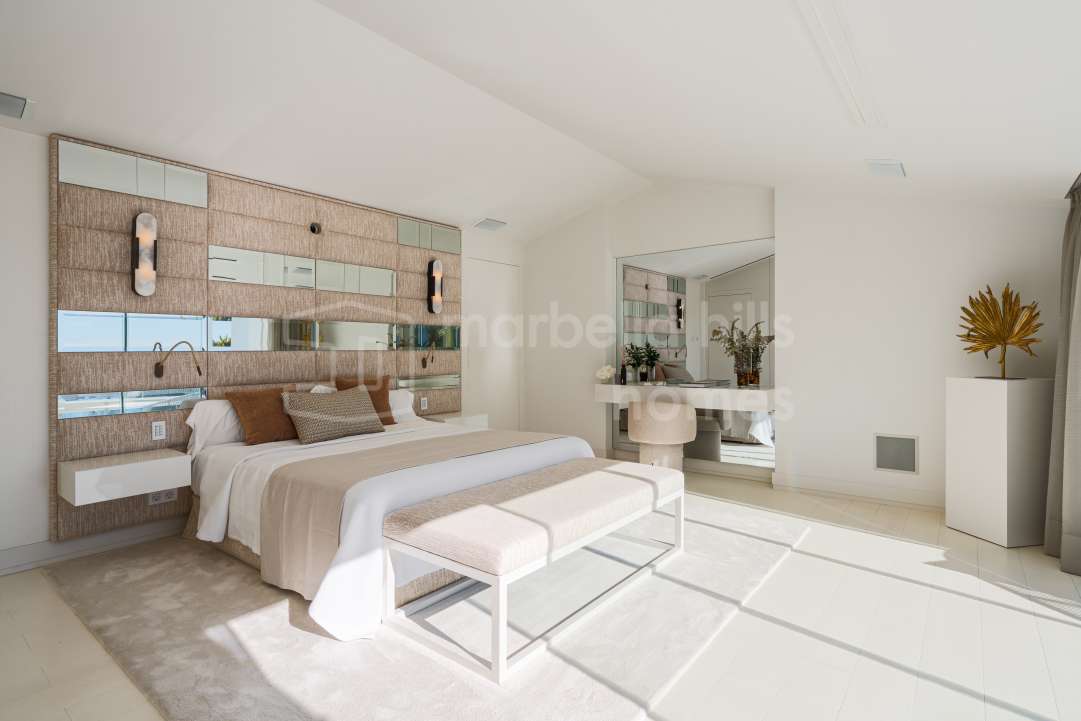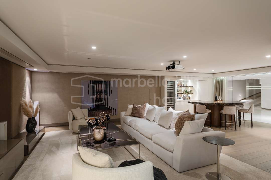 Villa contemporánea de 4 dormitorios en Puente Romano, Marbella Golden Mile. Piscina privada, vistas al mar, gimnasio y cine en ubicación exclusiva junto a la playa.