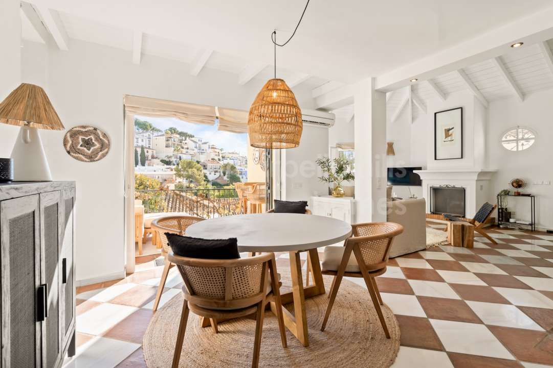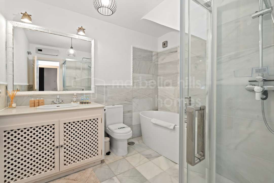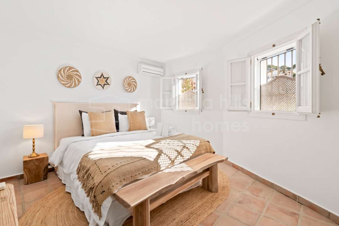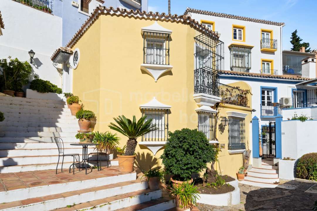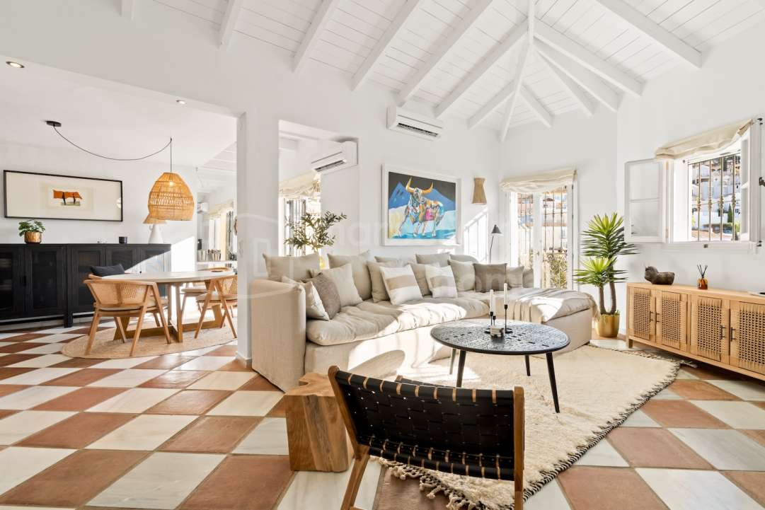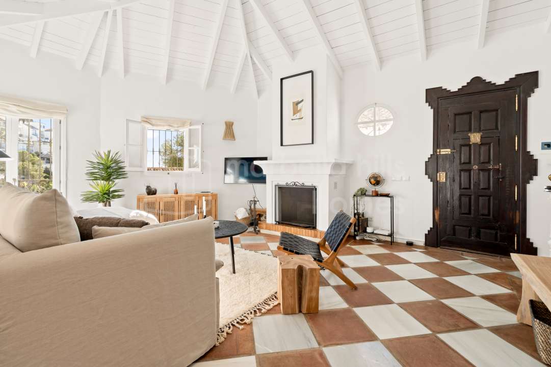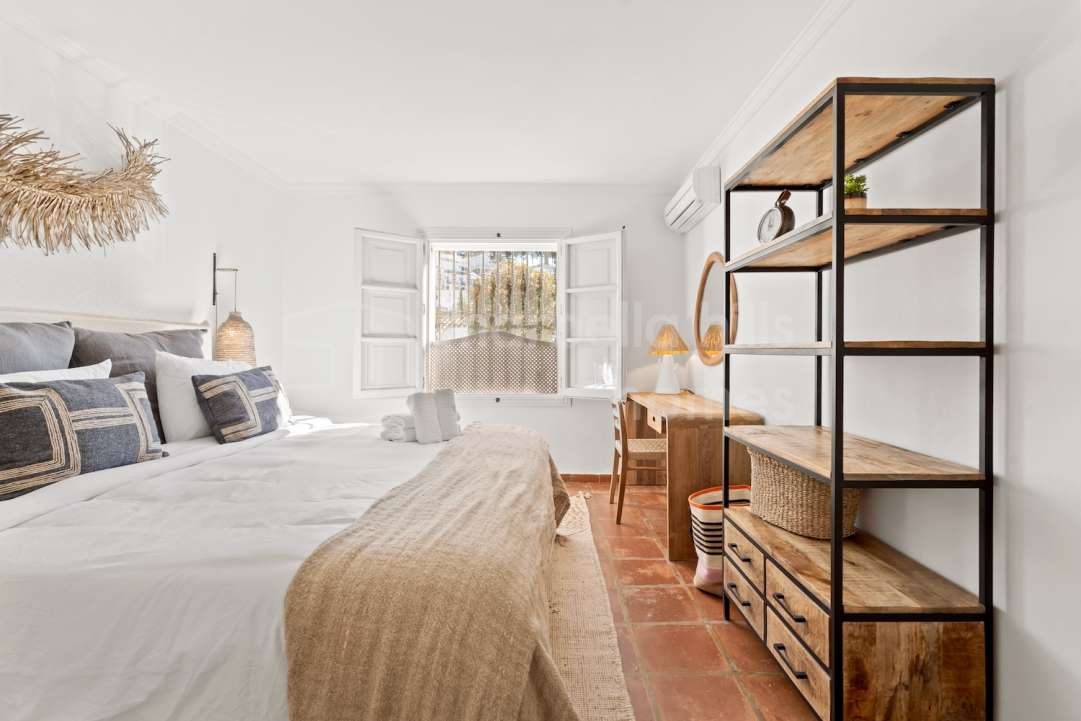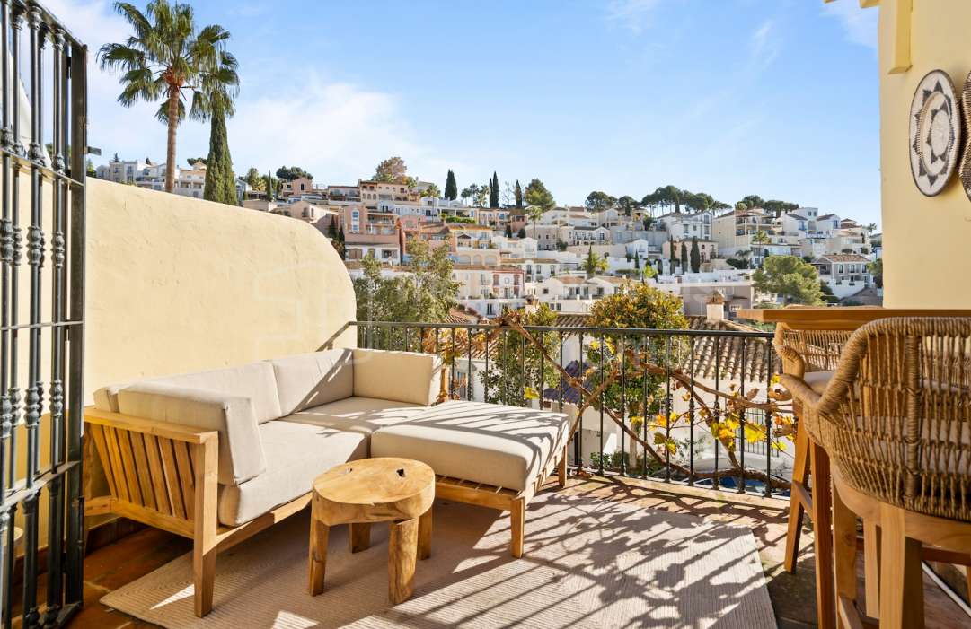 Encantadora casa adosada reformada en Lomas Pueblo en la Golden Mile de Marbella. Vivienda de 2 dormitorios con terrazas, jardines y piscina comunitaria cerca de Puente Romano.