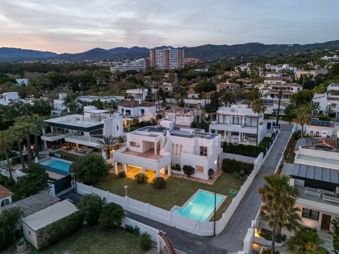 Villa de 6 dormitorios en El Rosario, Marbella Este, con 342 m² construidos, 1.097 m² de parcela, piscina privada, varias terrazas, solárium, cocina contemporánea, paneles...