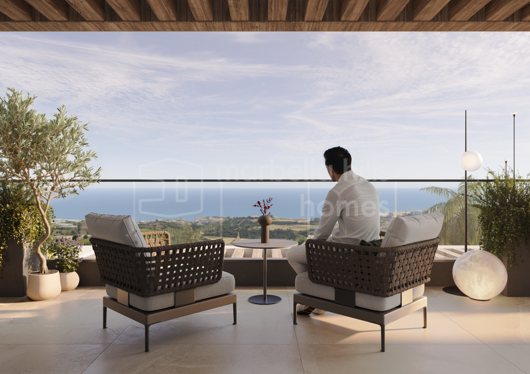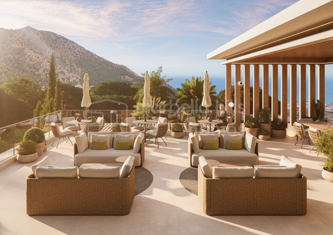 Apartamentos y villas de obra nueva en Buenavista, Mijas, con vistas panorámicas al mar, spa, piscinas, coworking y seguridad 24h. Entrega 2028/2029.