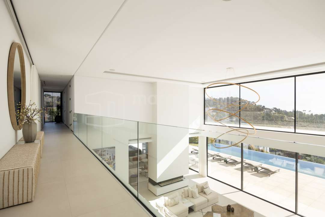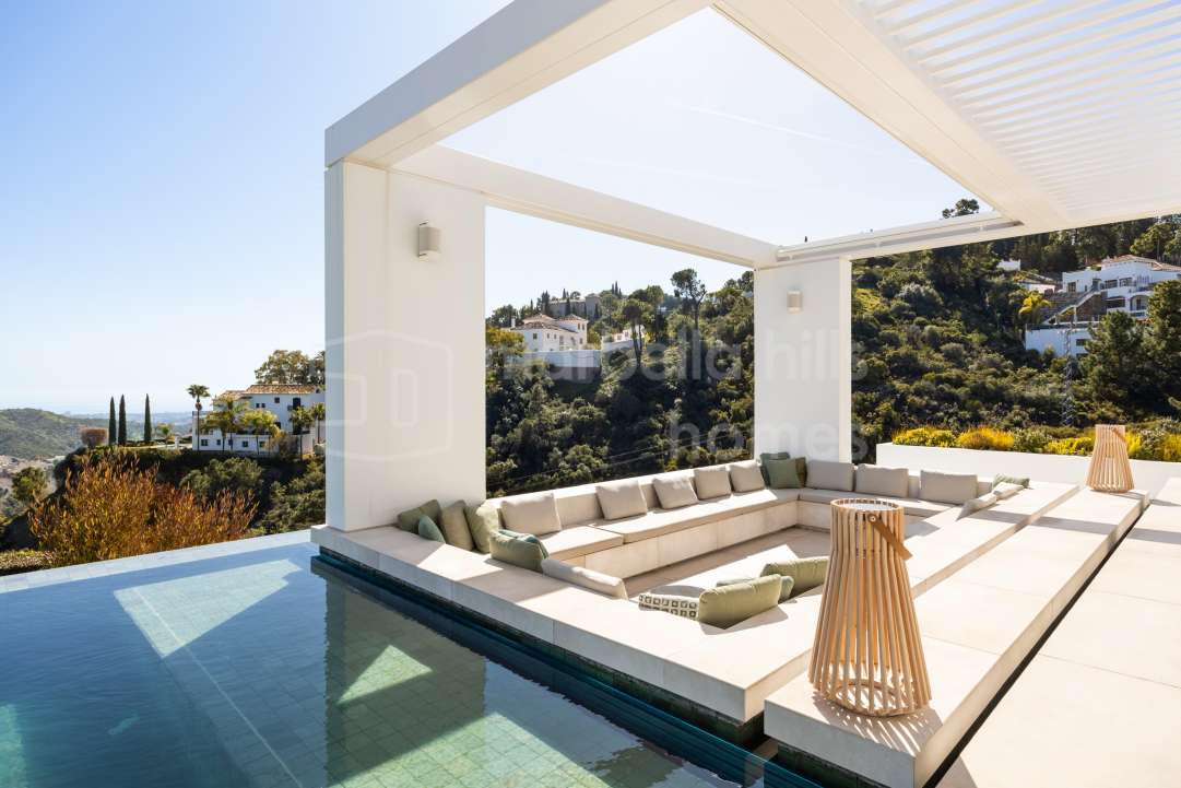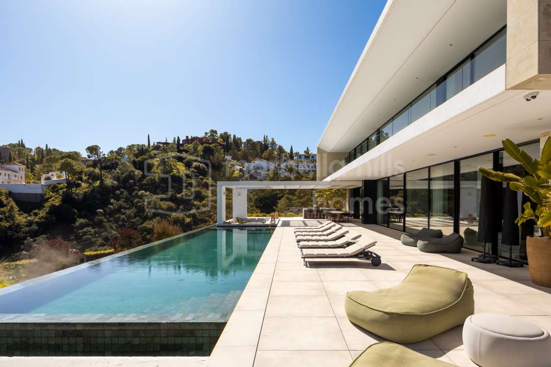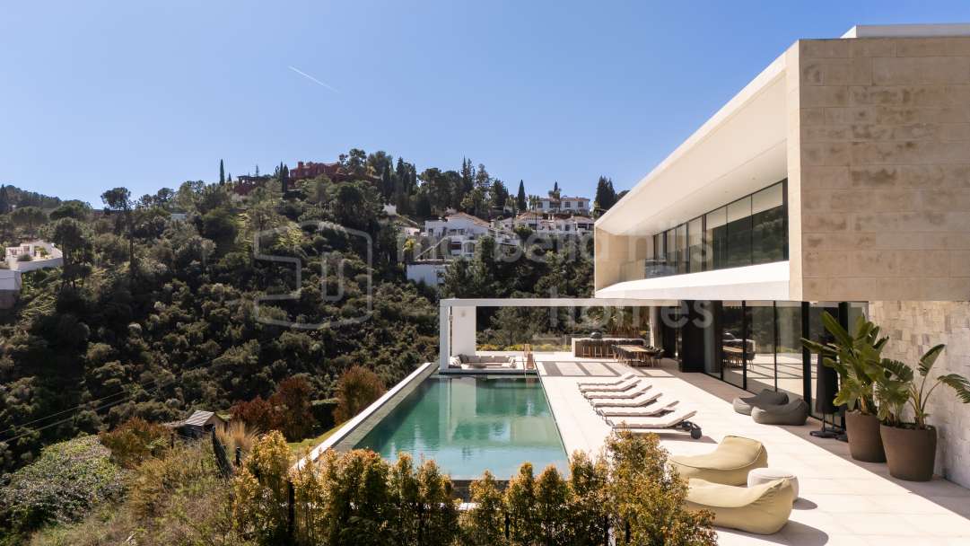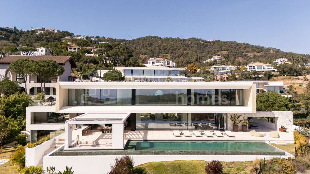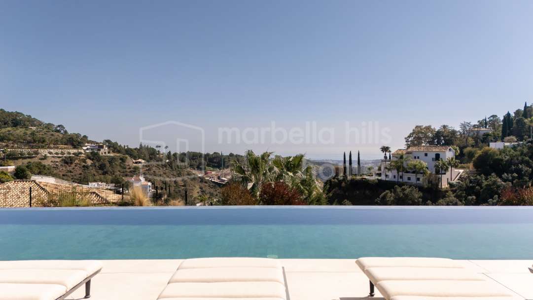 Villa moderna de lujo en venta en Monte Mayor, Benahavís. 5 dormitorios, casa de invitados, piscina infinity, vistas panorámicas al mar y montaña, diseño sostenible y máxima...