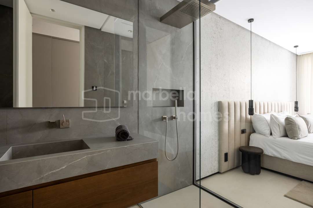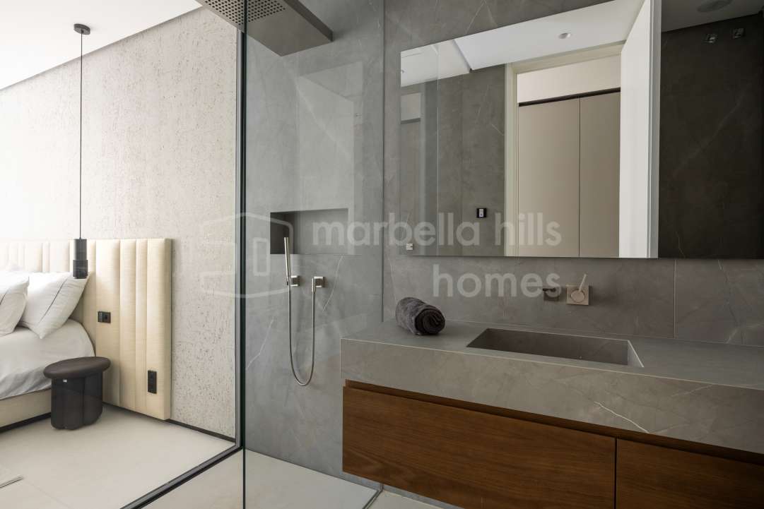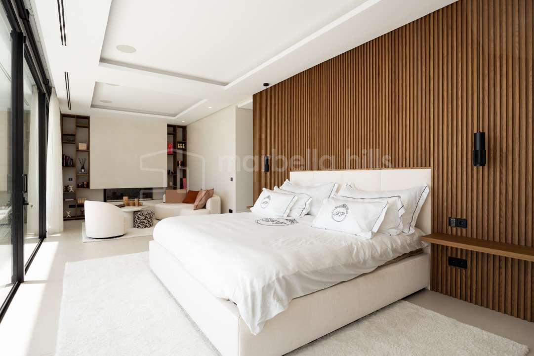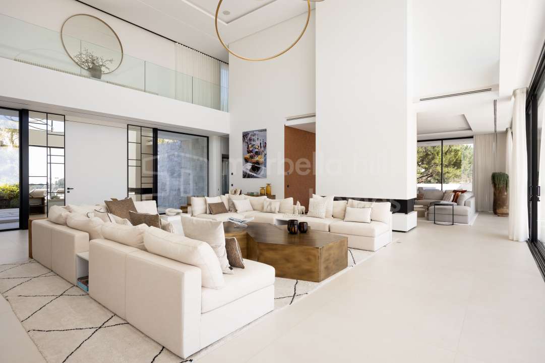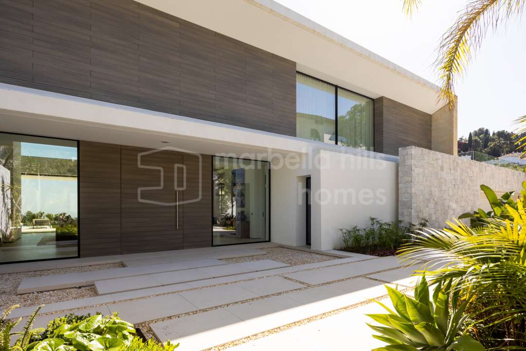 Villa moderna de lujo en venta en Monte Mayor, Benahavís. 5 dormitorios, casa de invitados, piscina infinity, vistas panorámicas al mar y montaña, diseño sostenible y máxima...
