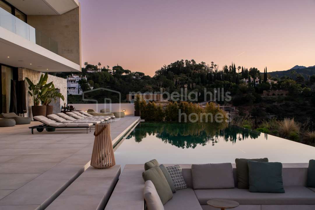 Villa de lujo en venta en El Madroñal Benahavís con vistas panorámicas al mar, piscina infinity y amplias terrazas. Villa contemporánea cerca de Marbella y Puerto Banús.