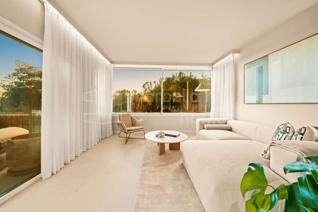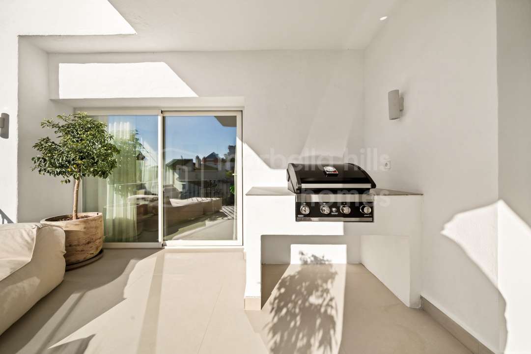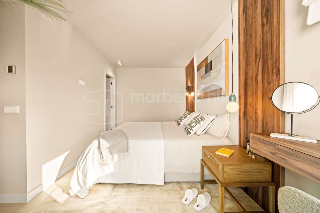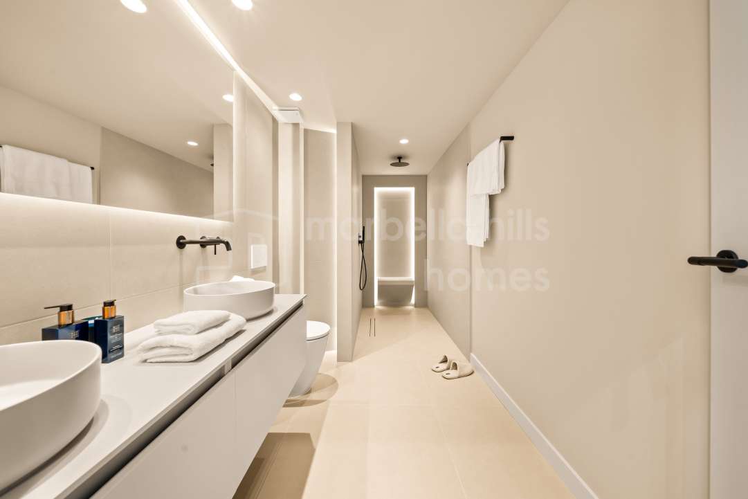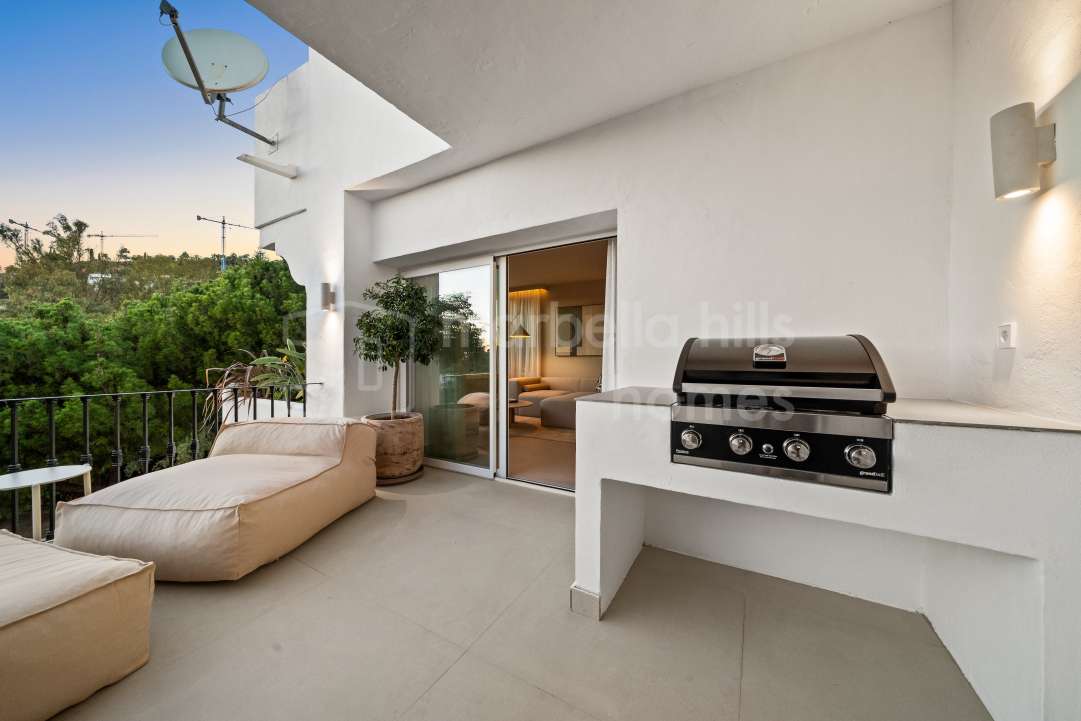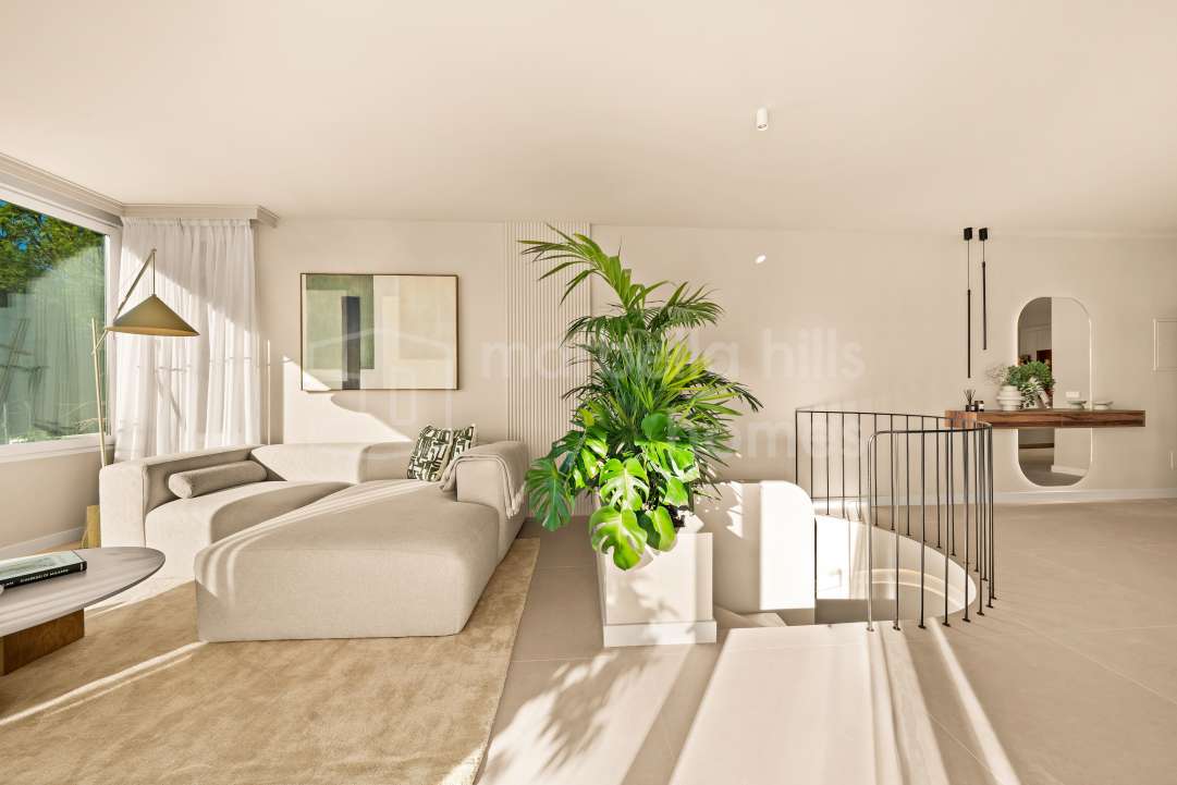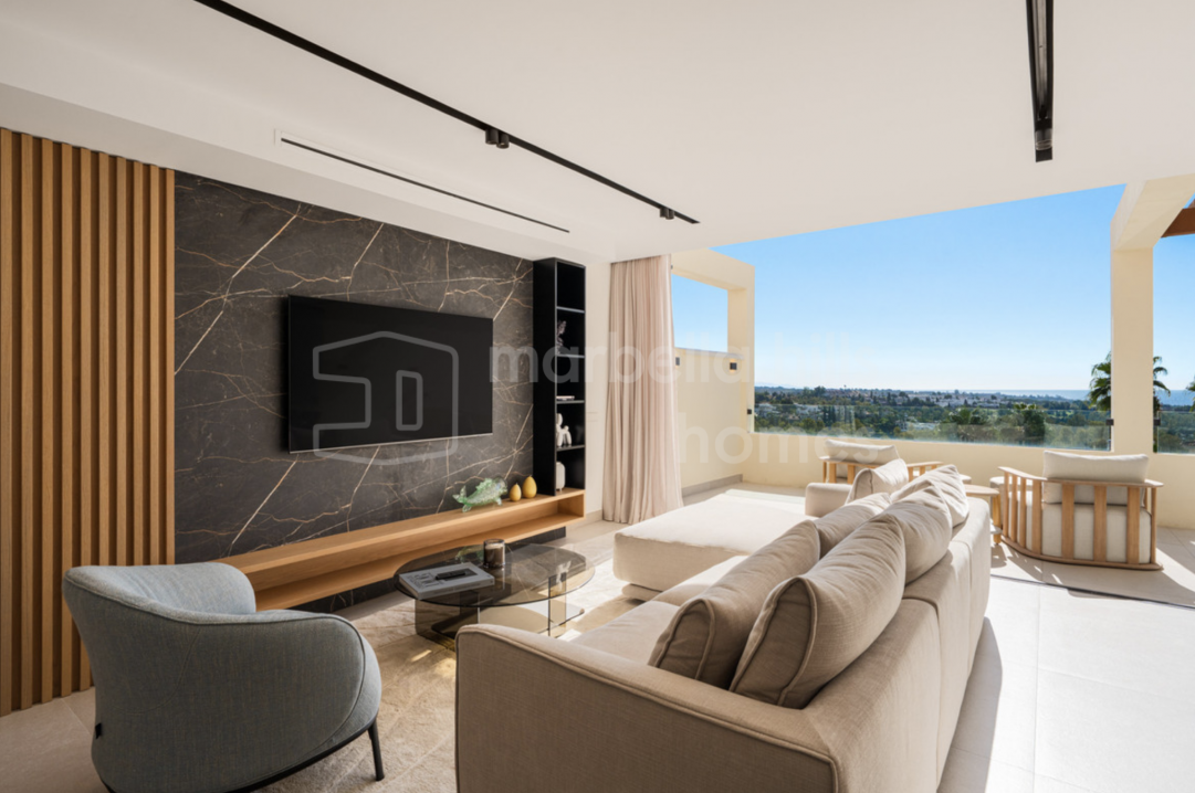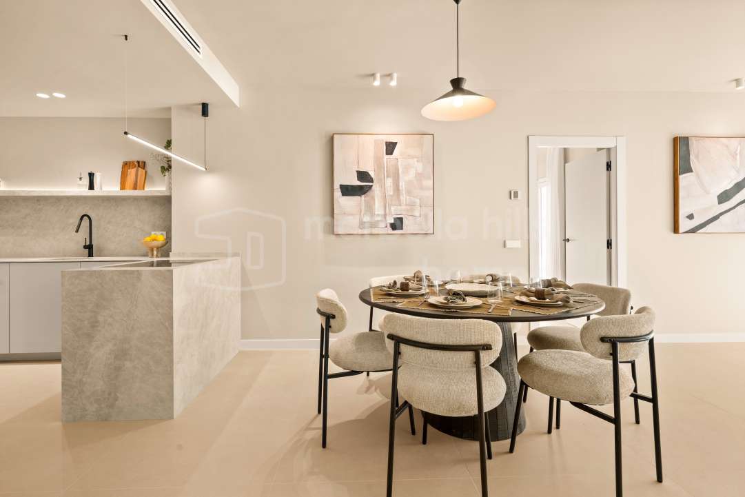 Appartement de 3 chambres entièrement rénové à Nueva Andalucía, avec terrasse privée, vues mer et montagne, design contemporain, parking privé, sécurité 24h et accès facile aux...