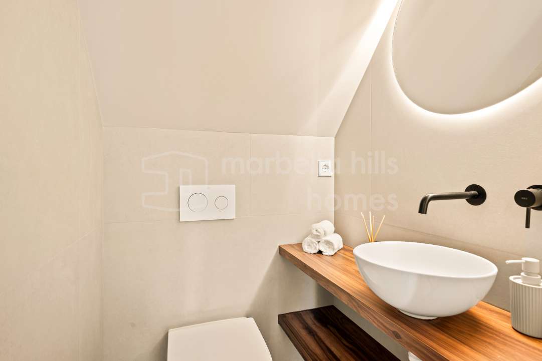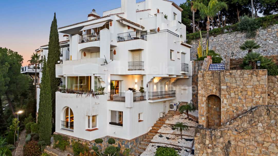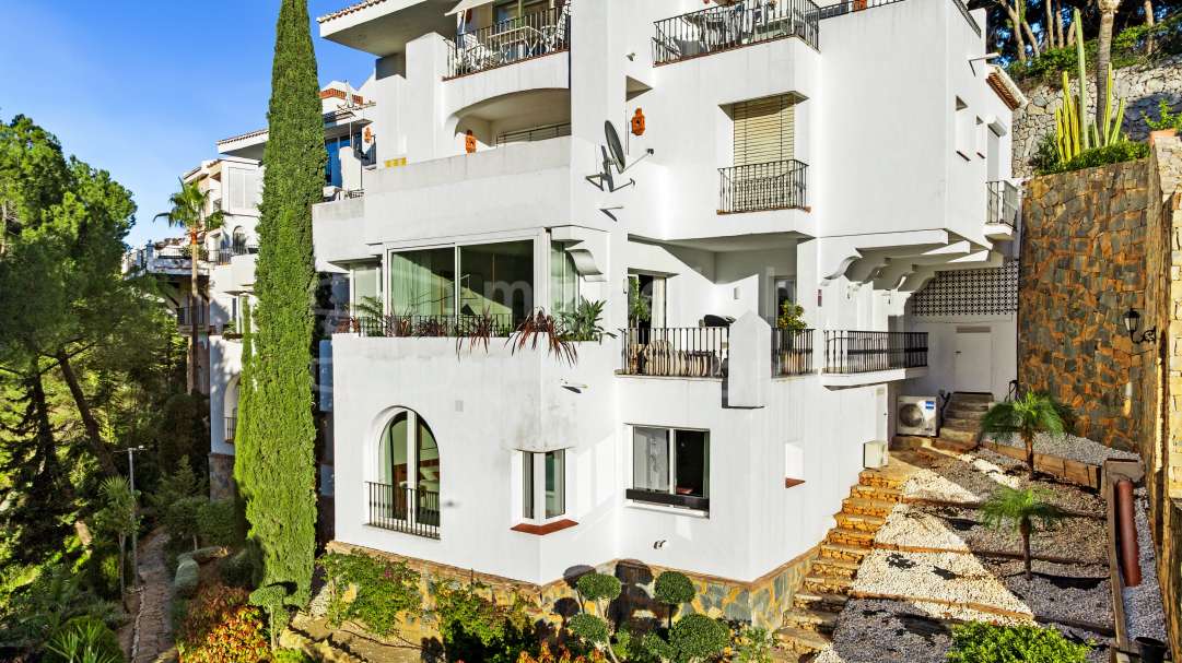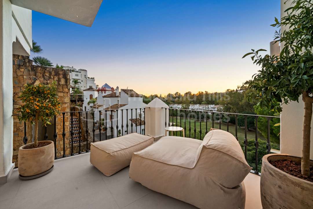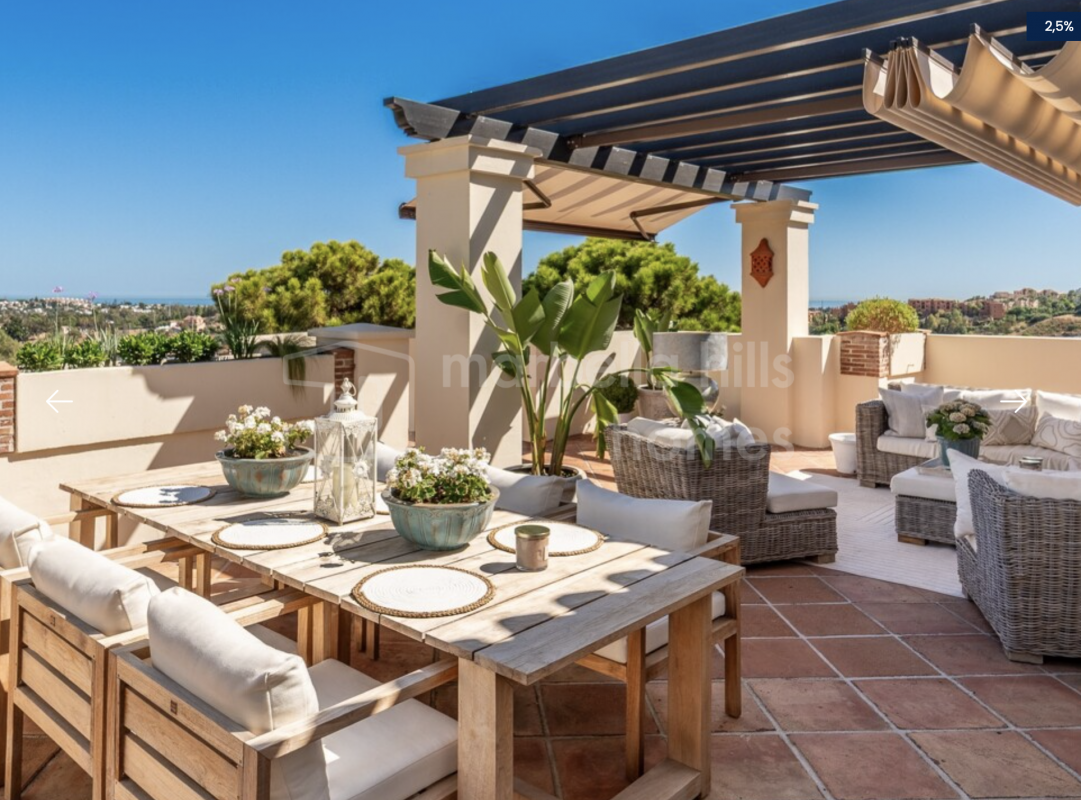 Penthouse duplex entièrement rénové à Benahavís avec 3 suites, grandes terrasses, parquet en chêne, dressing, sécurité 24h, tennis et padel. À vendre pour 925.000 €.