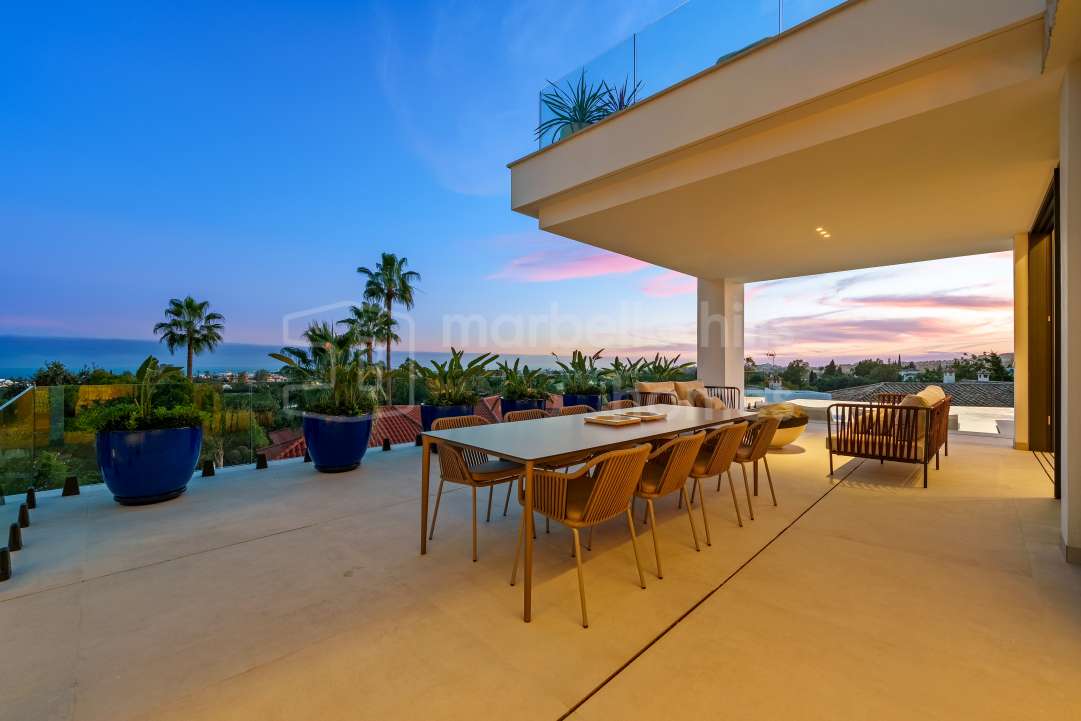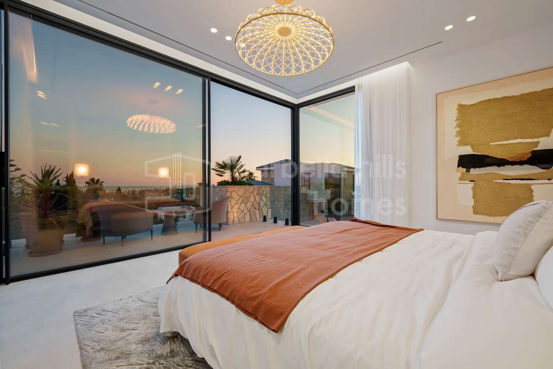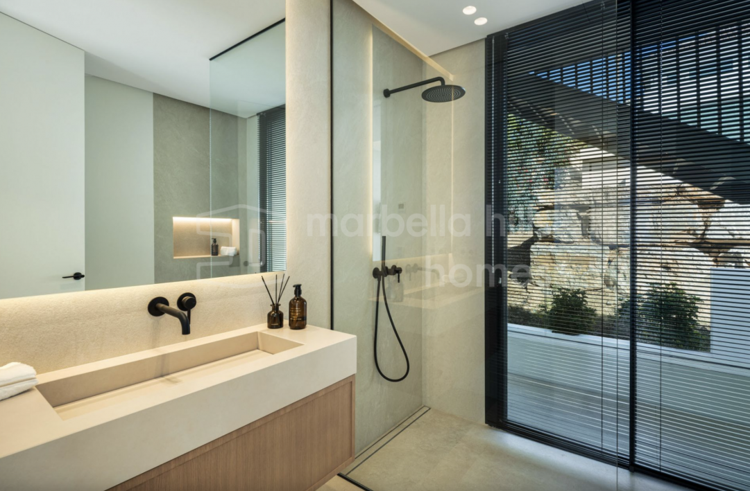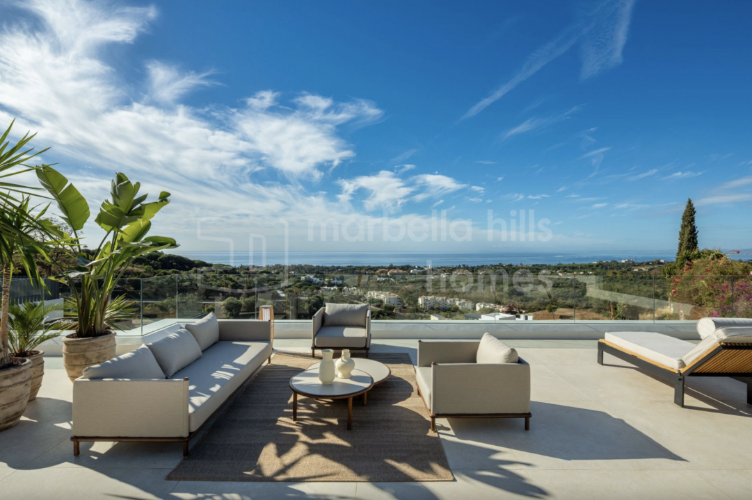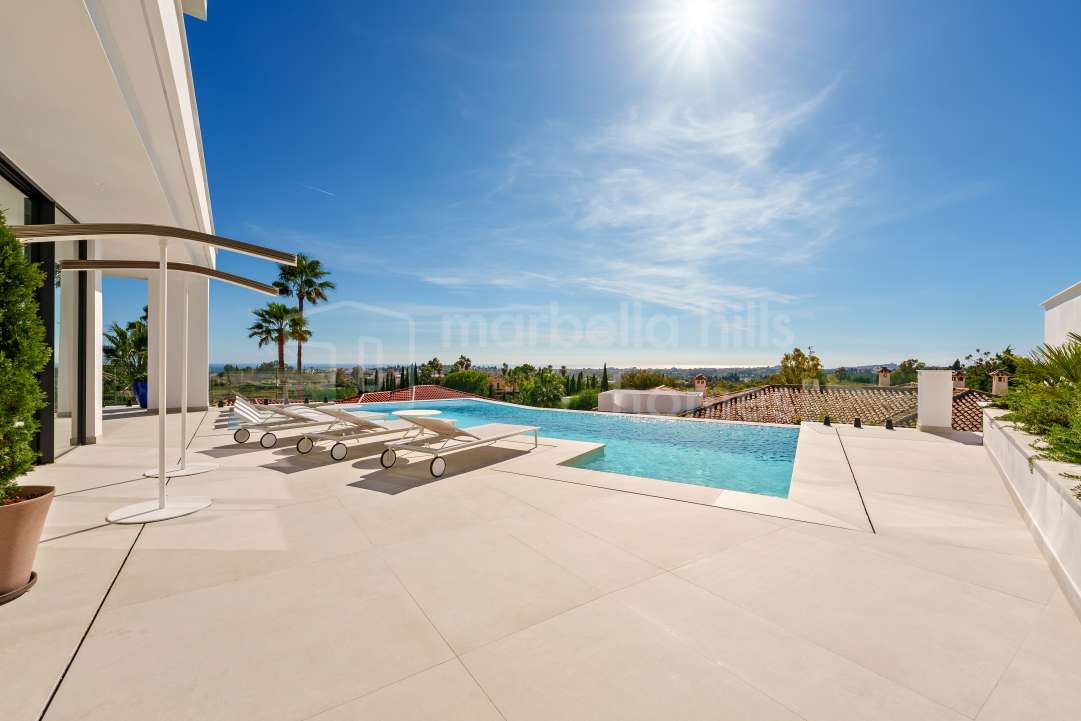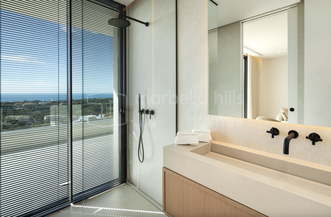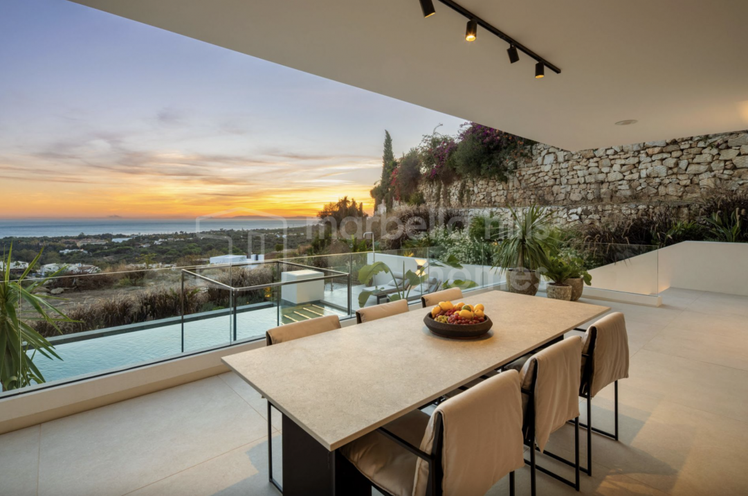 Villa neuve à Elviria, Marbella Est, orientation sud, vues mer, 5 suites, finitions haut de gamme, vastes terrasses, piscine privée et design contemporain. Option mobilier...
