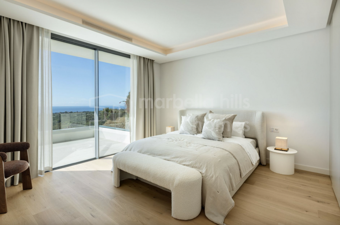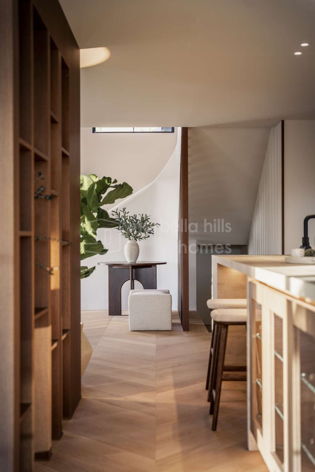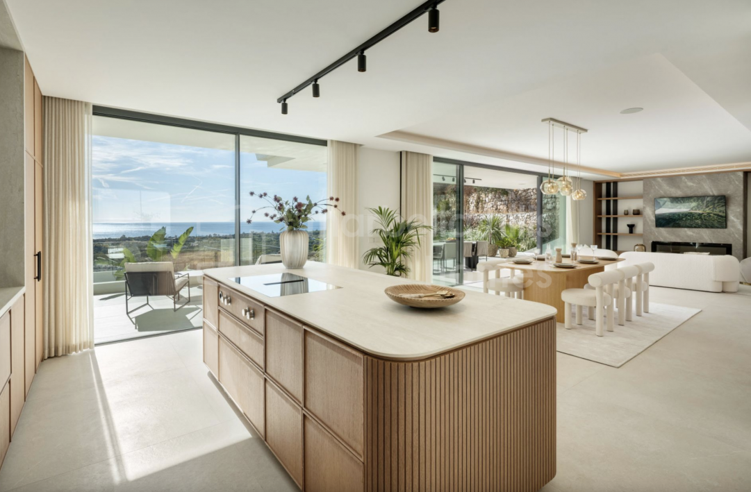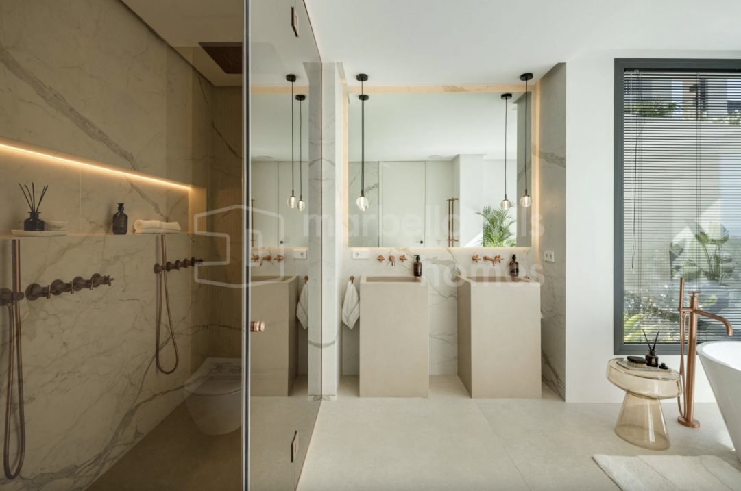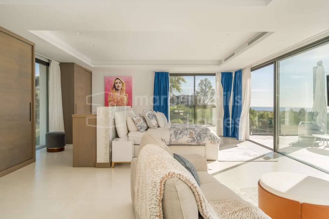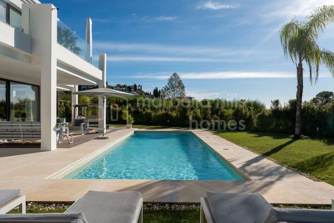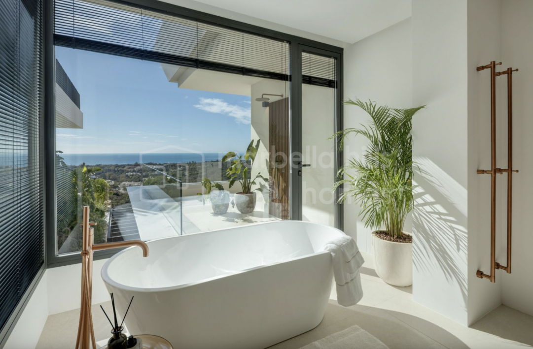 Villa neuve à Elviria, Marbella Est, orientation sud, vues mer, 5 suites, finitions haut de gamme, vastes terrasses, piscine privée et design contemporain. Option mobilier...