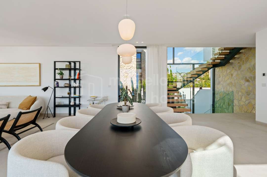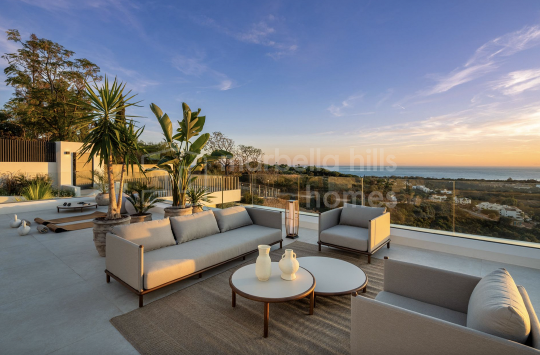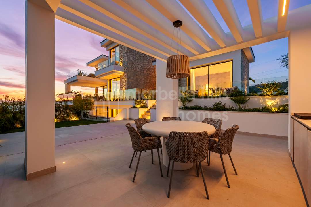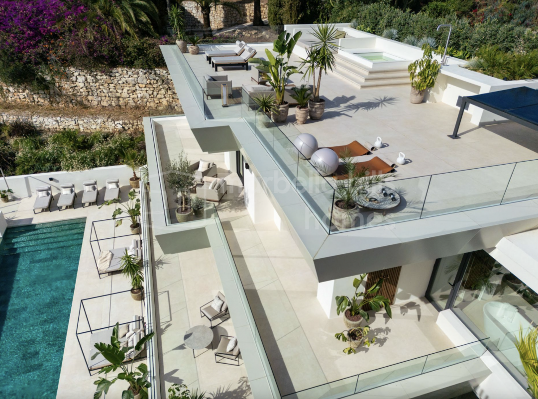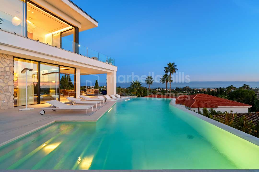 Villa moderne de 5 chambres à La Quinta, Benahavís, avec vues panoramiques sur la mer et la vallée. 606 m² construits, 307 m² de terrasses, piscine à débordement, salle de...