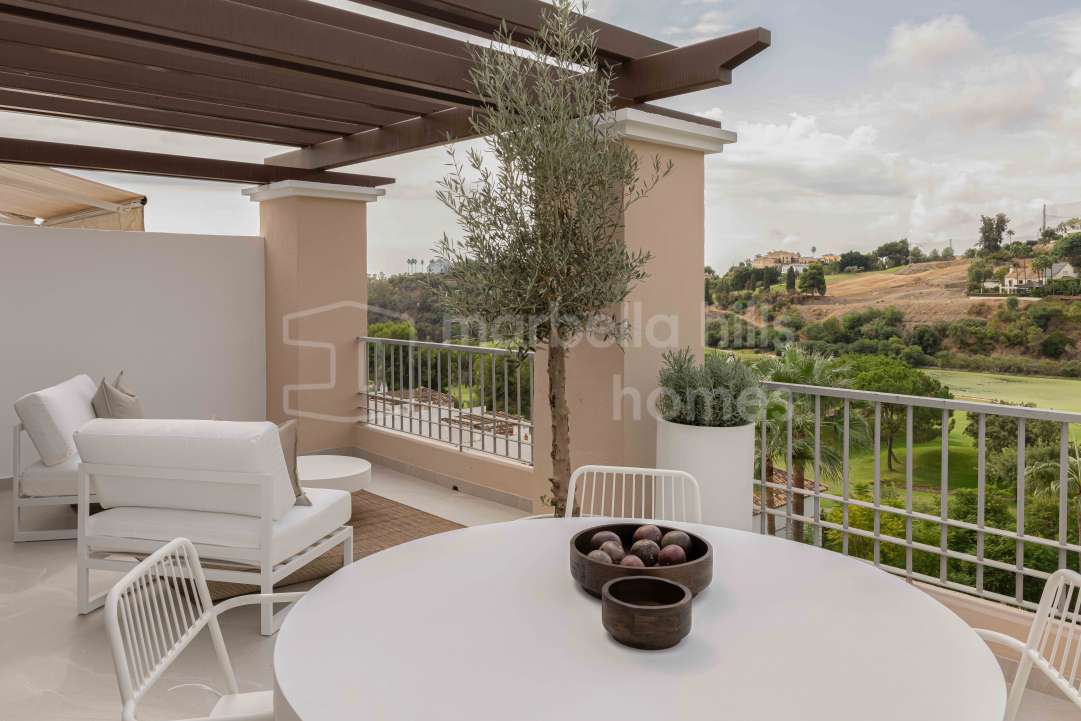 Superbe penthouse duplex à Los Capanes del Golf, Benahavís, avec plus de 100 m² de terrasses, 3 suites, niveau privé pour la suite parentale, prestations de type resort et deux...