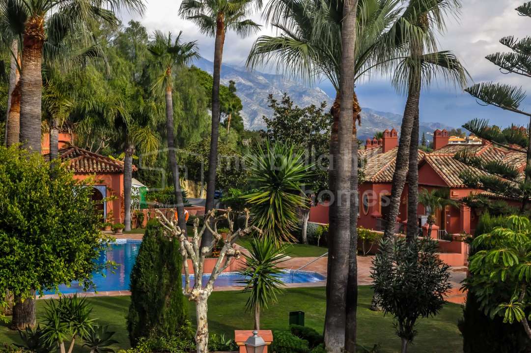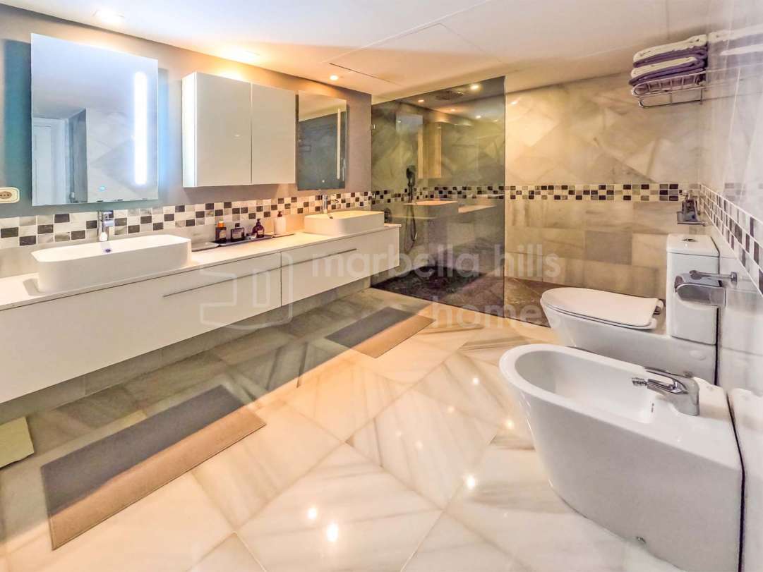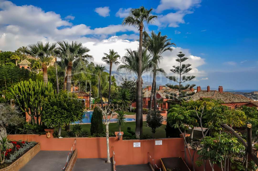 Penthouse exclusif de 1 chambre à Los Arqueros, Benahavís, entièrement rénové avec finitions haut de gamme, grande terrasse d’angle, vue sur la mer, garage et débarras.