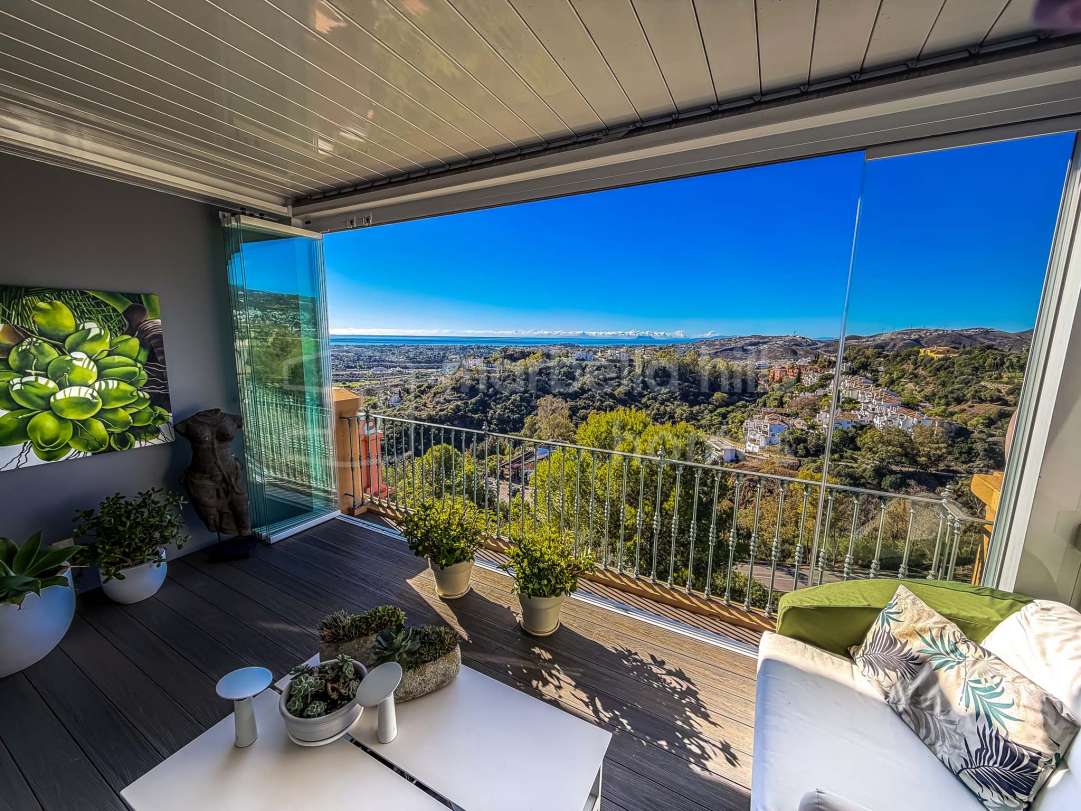 Penthouse rénové de 3 chambres à Altos de La Quinta, Benahavís. Vues panoramiques sur la mer, le golf et la montagne, terrasse privée avec cuisine extérieure. Prix 950 000 €.