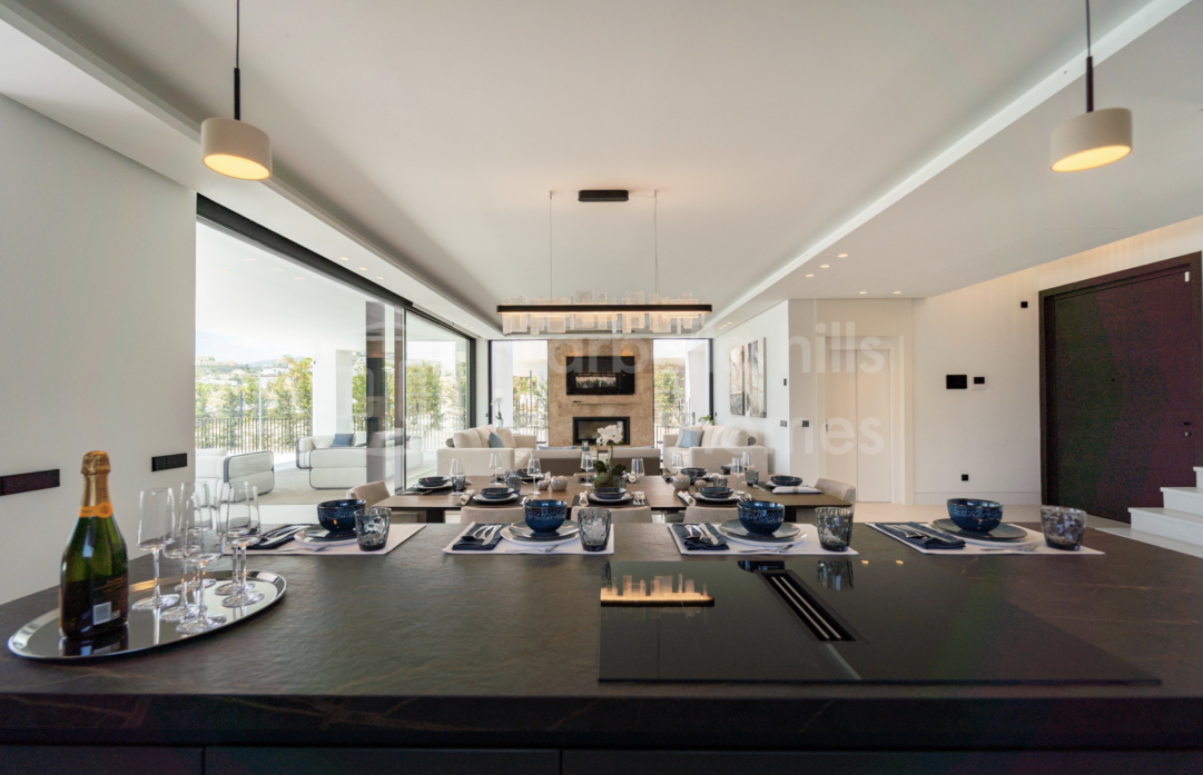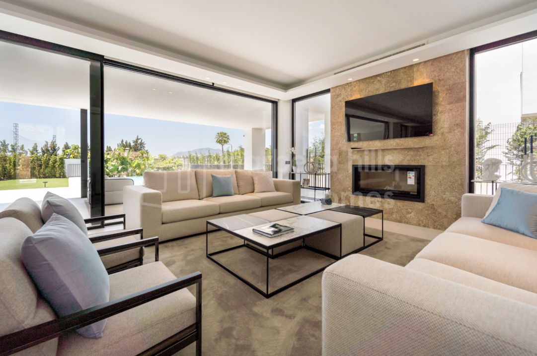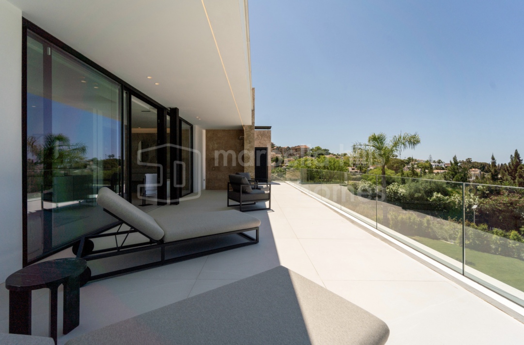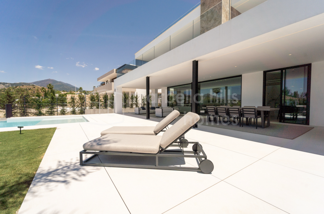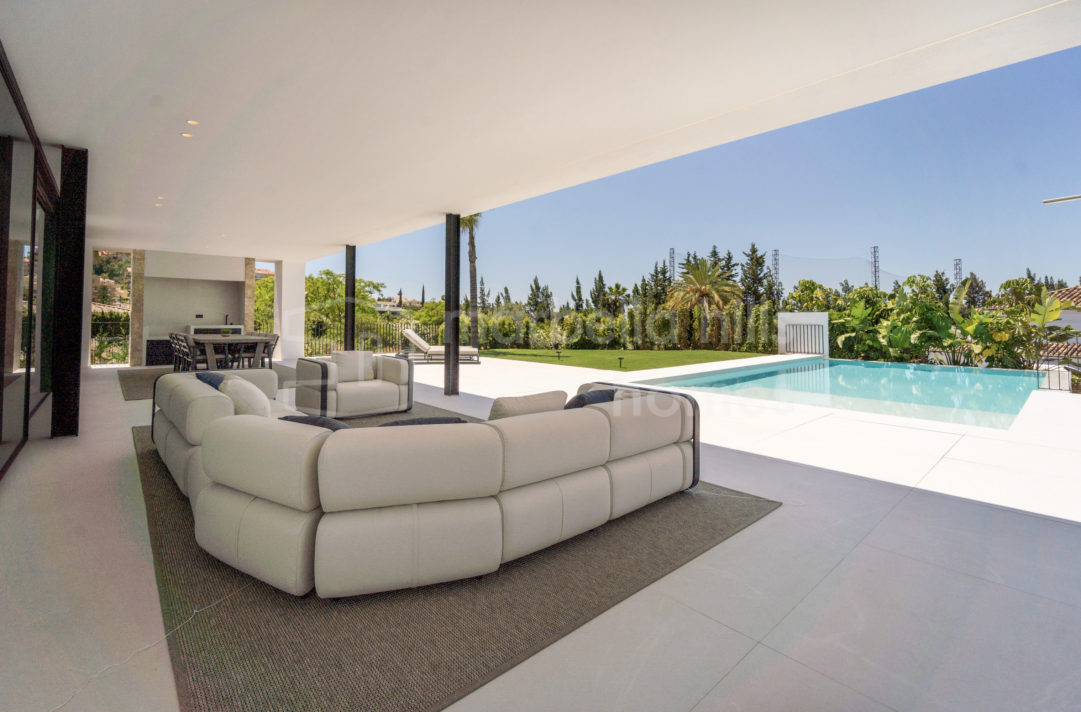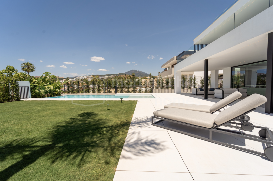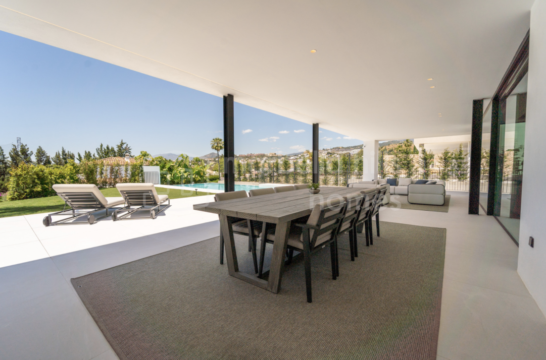 Villa moderne de style scandinave à Nueva Andalucía avec vues panoramiques, jardin, piscine, terrasses et orientation sud-ouest dans le prestigieux Golf Valley de Marbella.