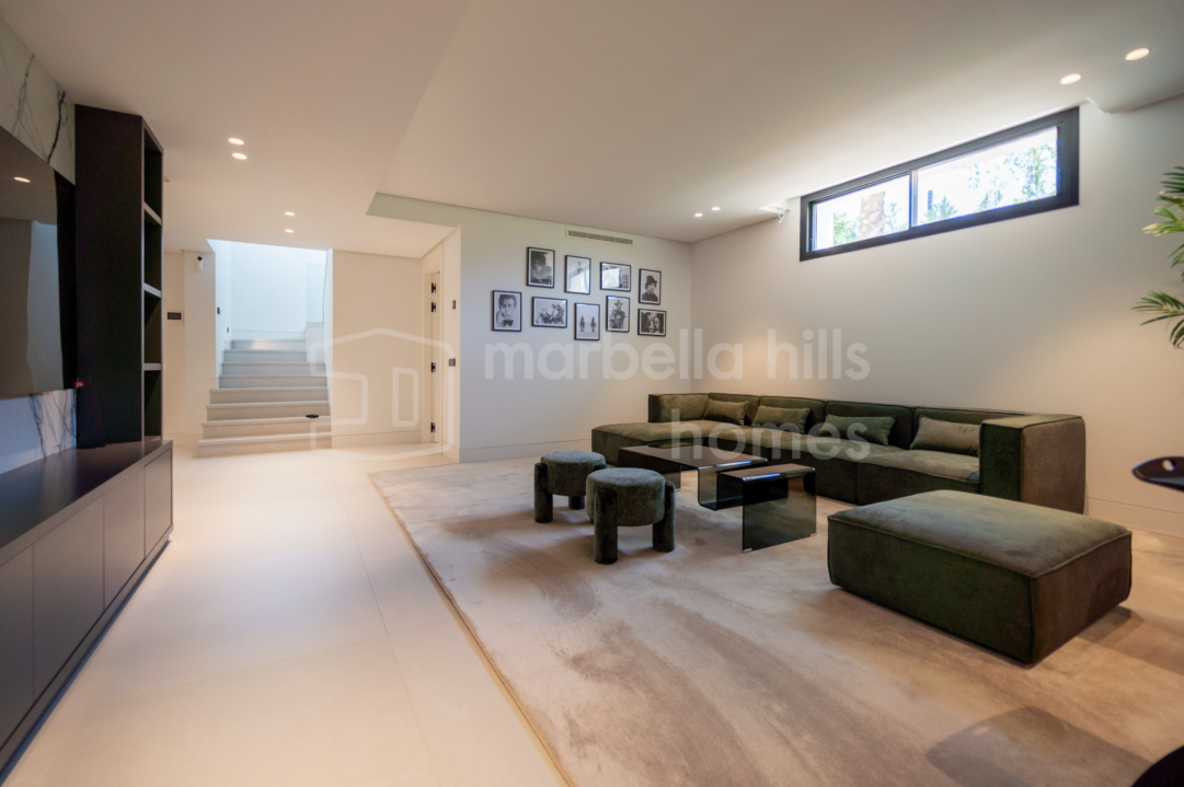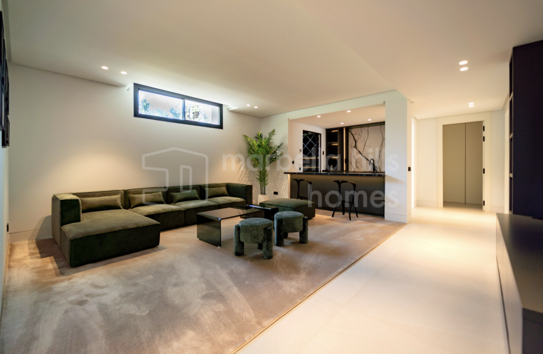 Maison moderne à Nueva Andalucía avec piscine, solarium, salle de sport et cinéma privé, à quelques minutes de Puerto Banús et des golfs de Marbella.