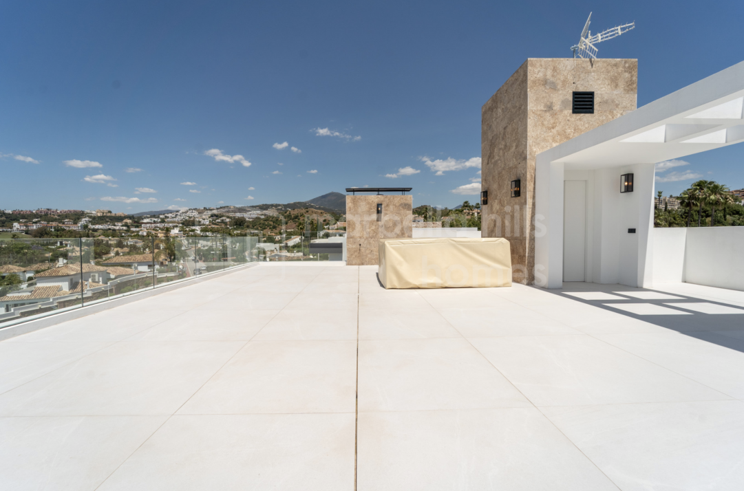 Villa contemporaine entièrement rénovée à Nueva Andalucía offrant des vues panoramiques sur la mer et la montagne, jacuzzi sur le toit, piscine privée, appartement d’invités et...