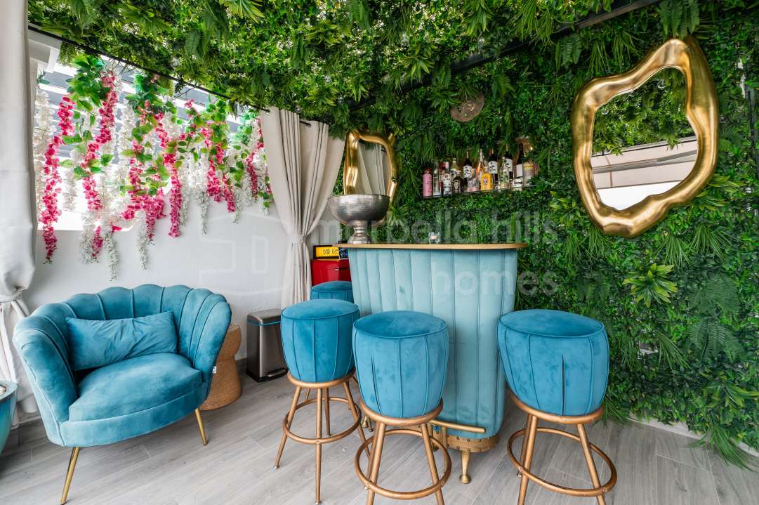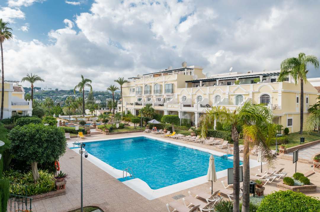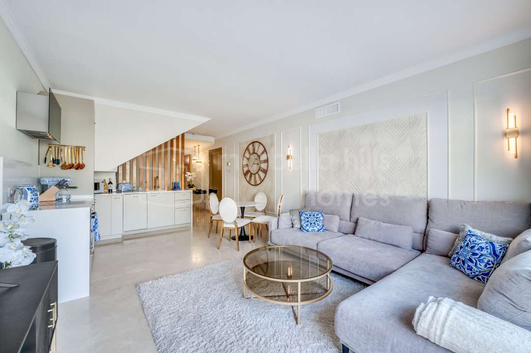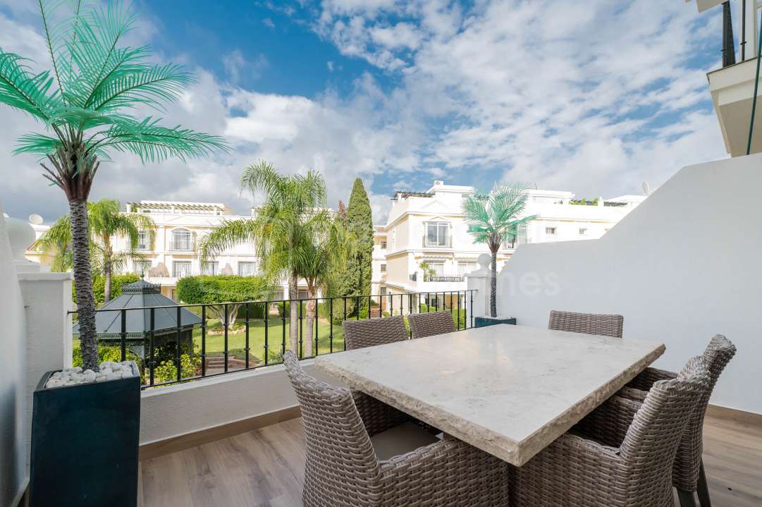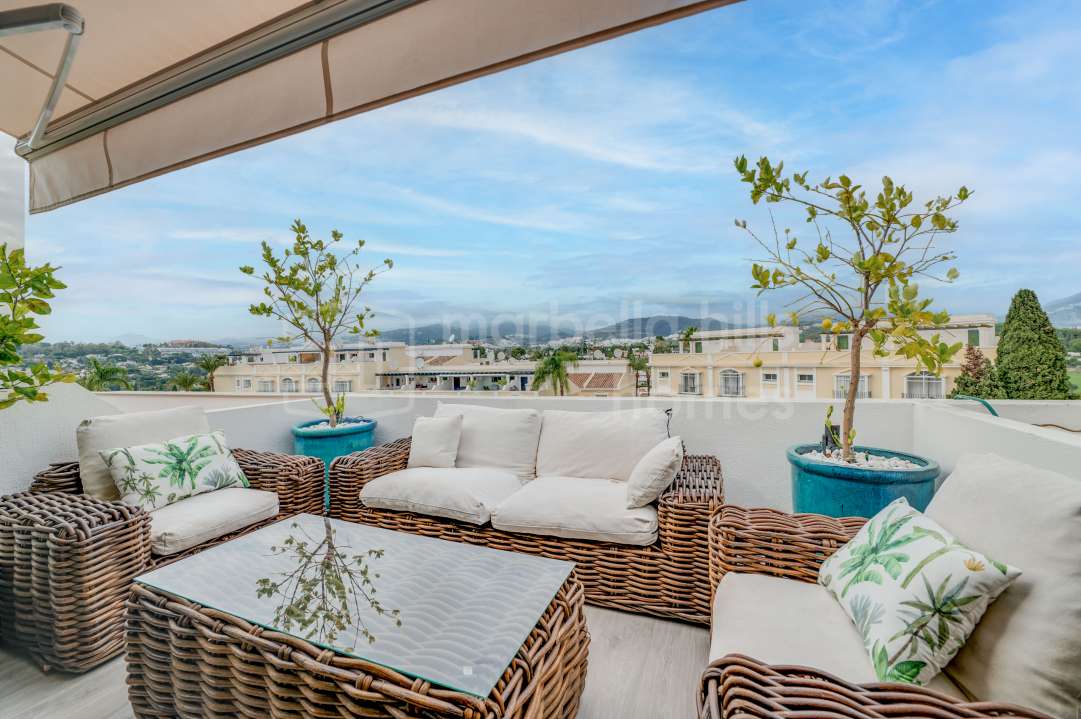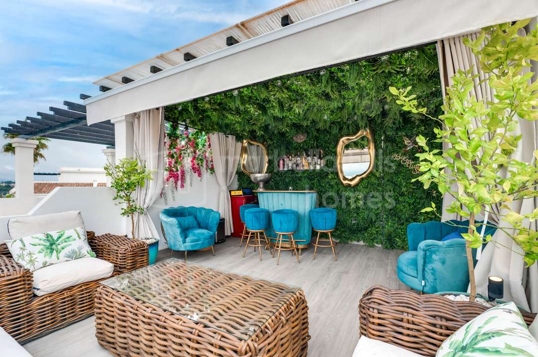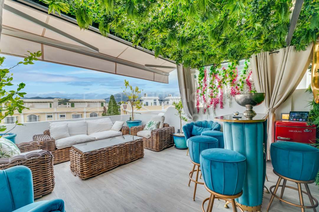 Duplex rénové 3 chambres à Aloha Gardens, Nueva Andalucía, Marbella. 160m² construits, 93m² de terrasses, terrasse privée avec bar, proche de Puerto Banús.