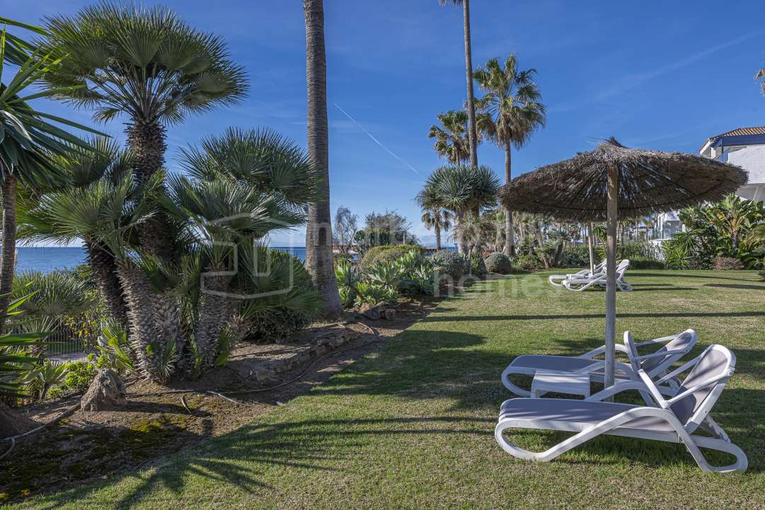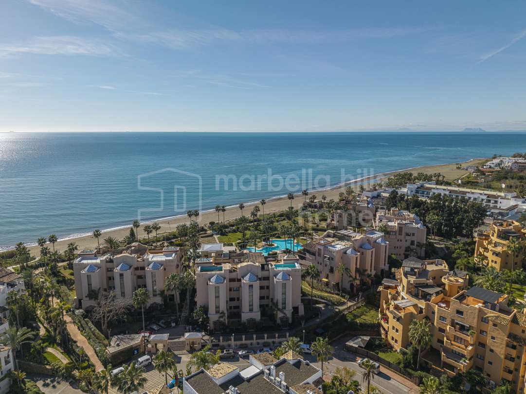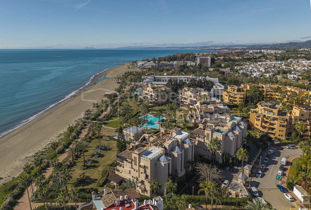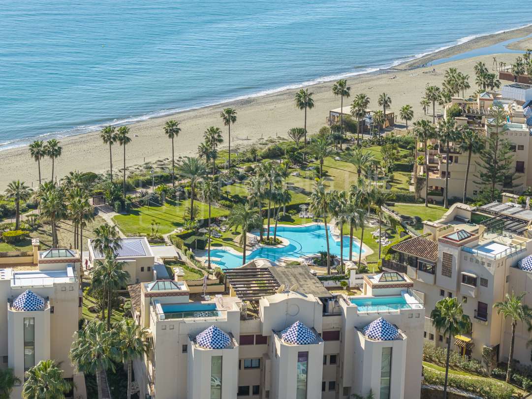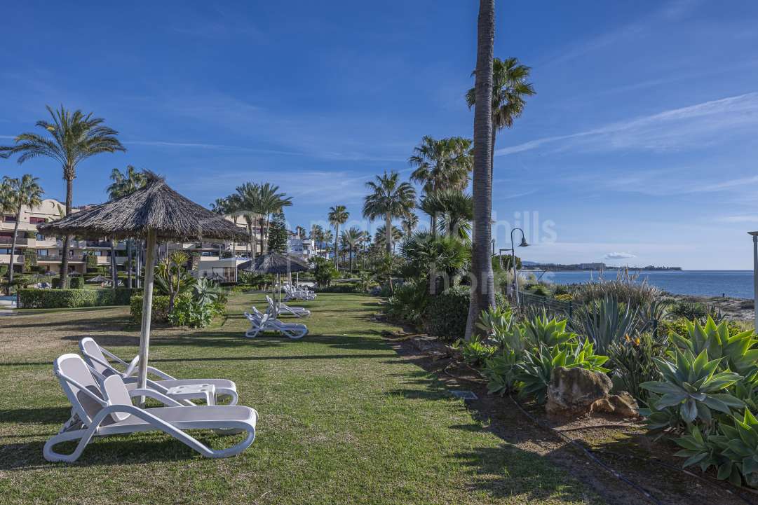 Appartement en première ligne de plage à vendre à Costalita del Mar Estepona. Propriété de 3 chambres avec grande terrasse, jardins tropicaux, piscine et accès direct à la plage...
