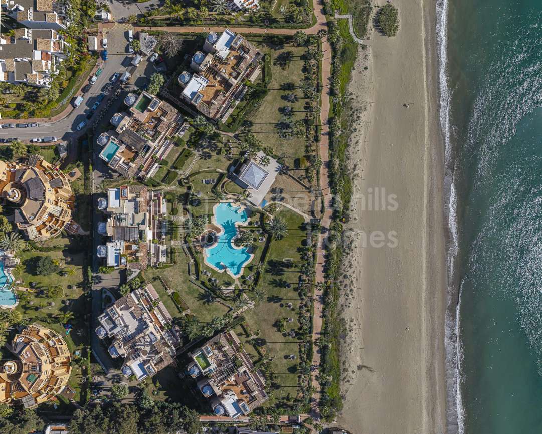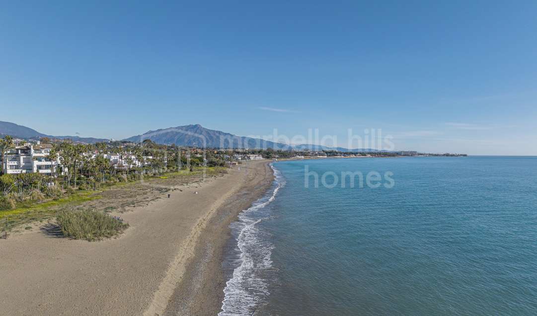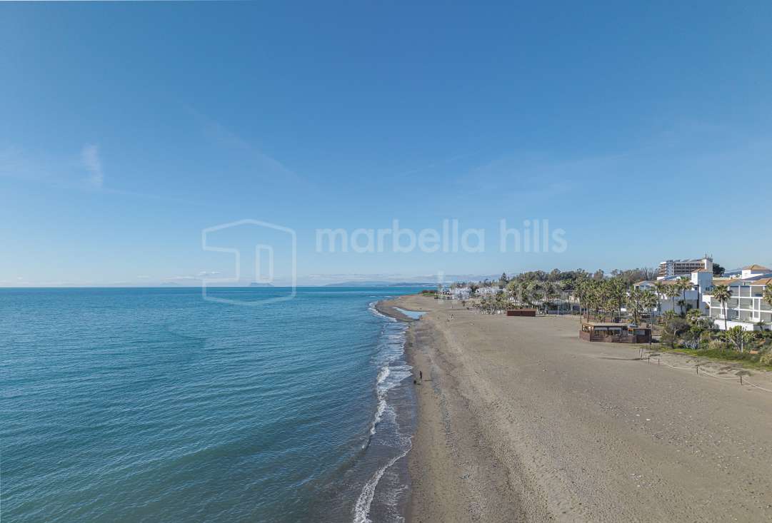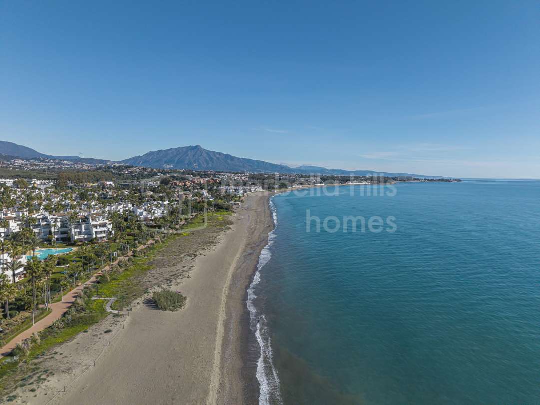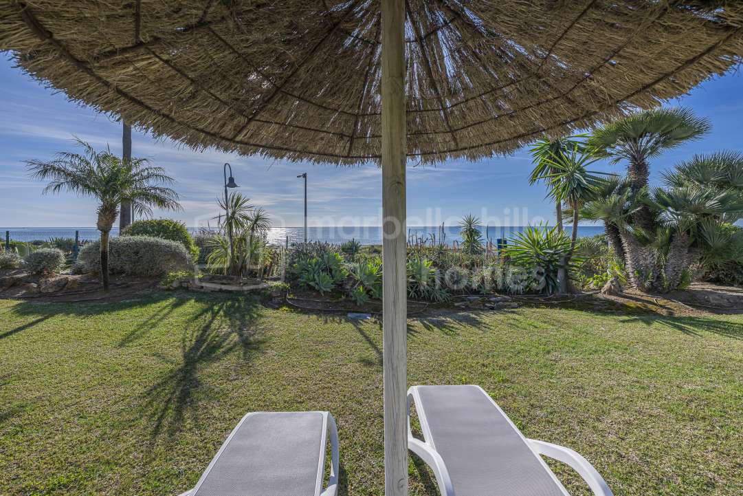 Appartement en première ligne de plage à vendre à Costalita del Mar Estepona. Propriété de 3 chambres avec grande terrasse, jardins tropicaux, piscine et accès direct à la plage...