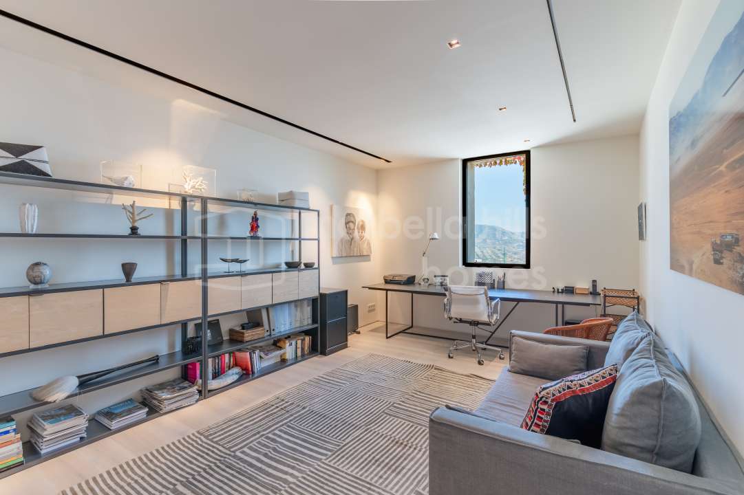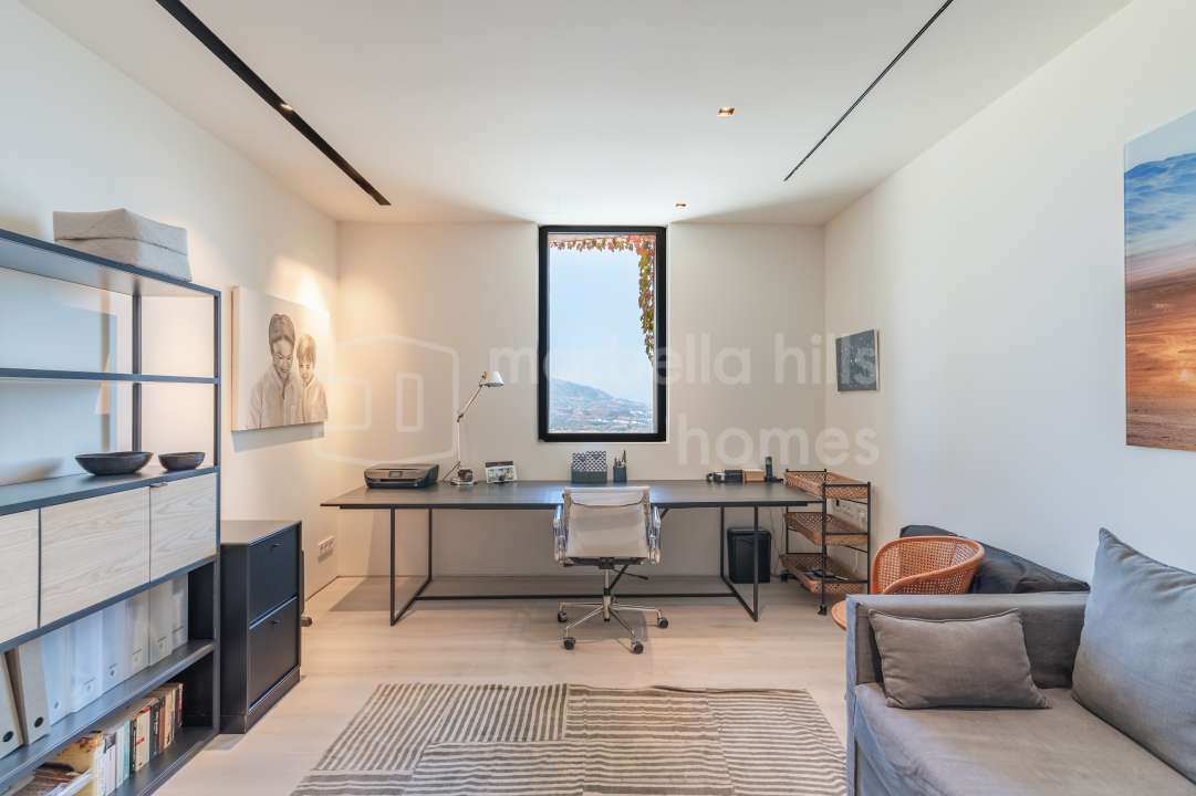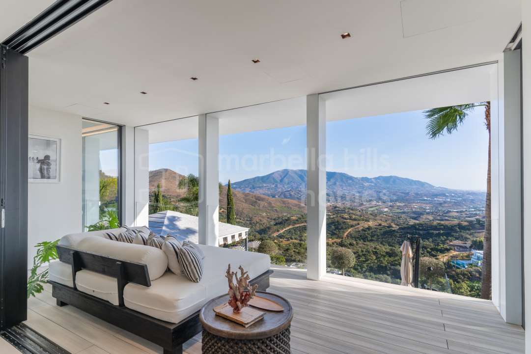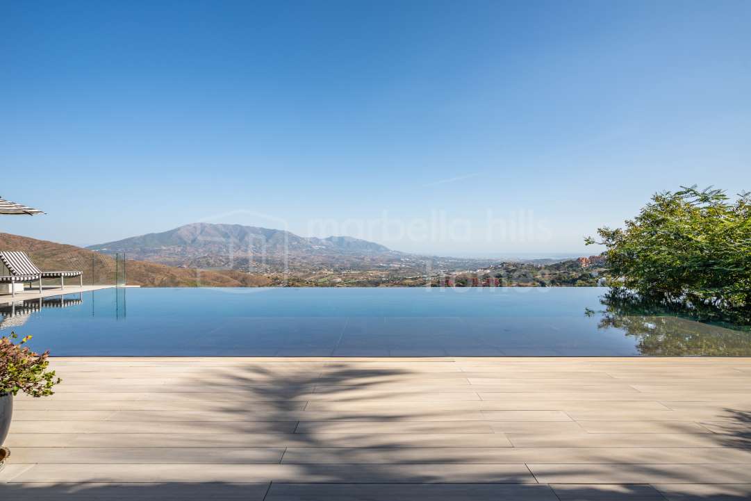 Superbe villa de six chambres à vendre à La Mairena, Ojén, offrant vues mer et montagne, piscine à débordement, salle de sport, sauna et espaces contemporains répartis sur trois...