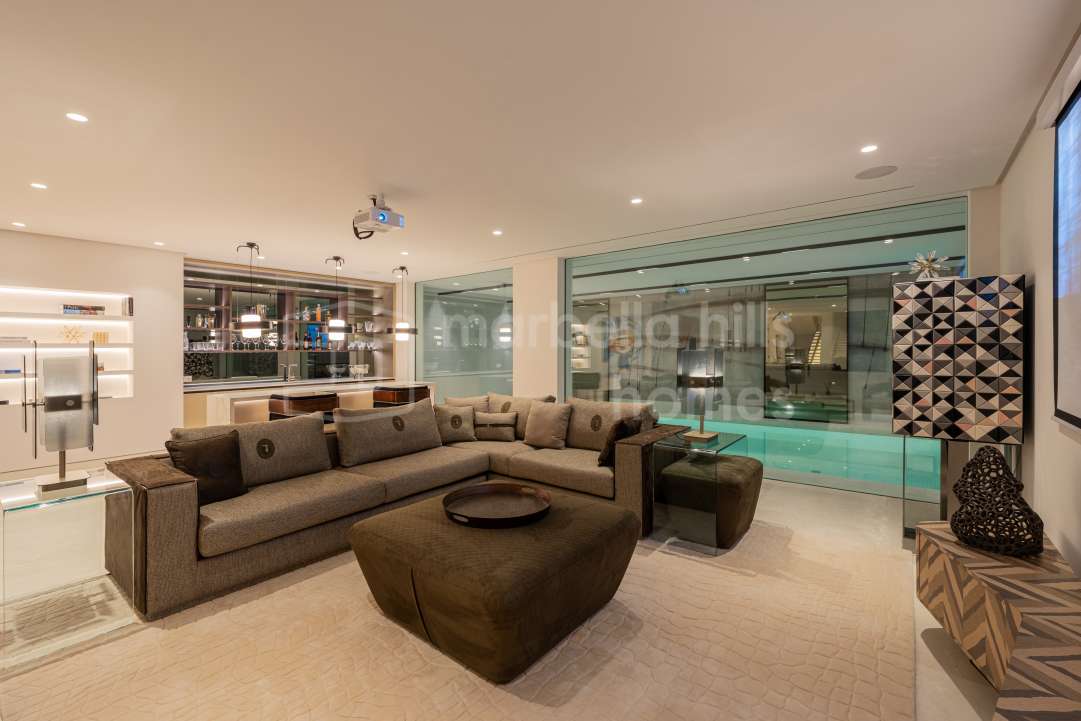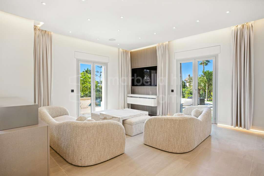 Villa moderne à vendre à Altos de Salamanca, Golden Mile – rénovée, 5 chambres, salle de sport, cinéma, solarium et vues mer.