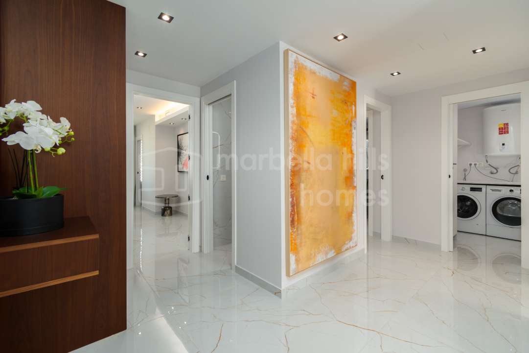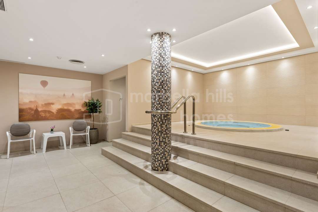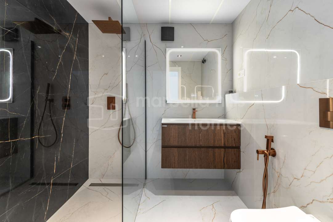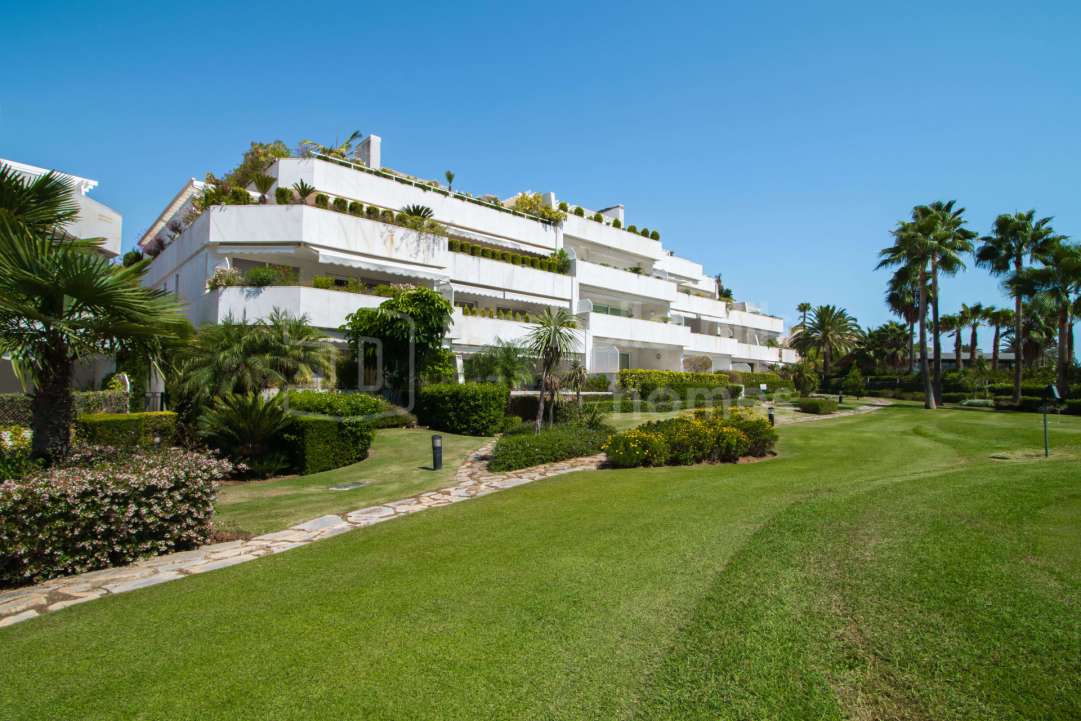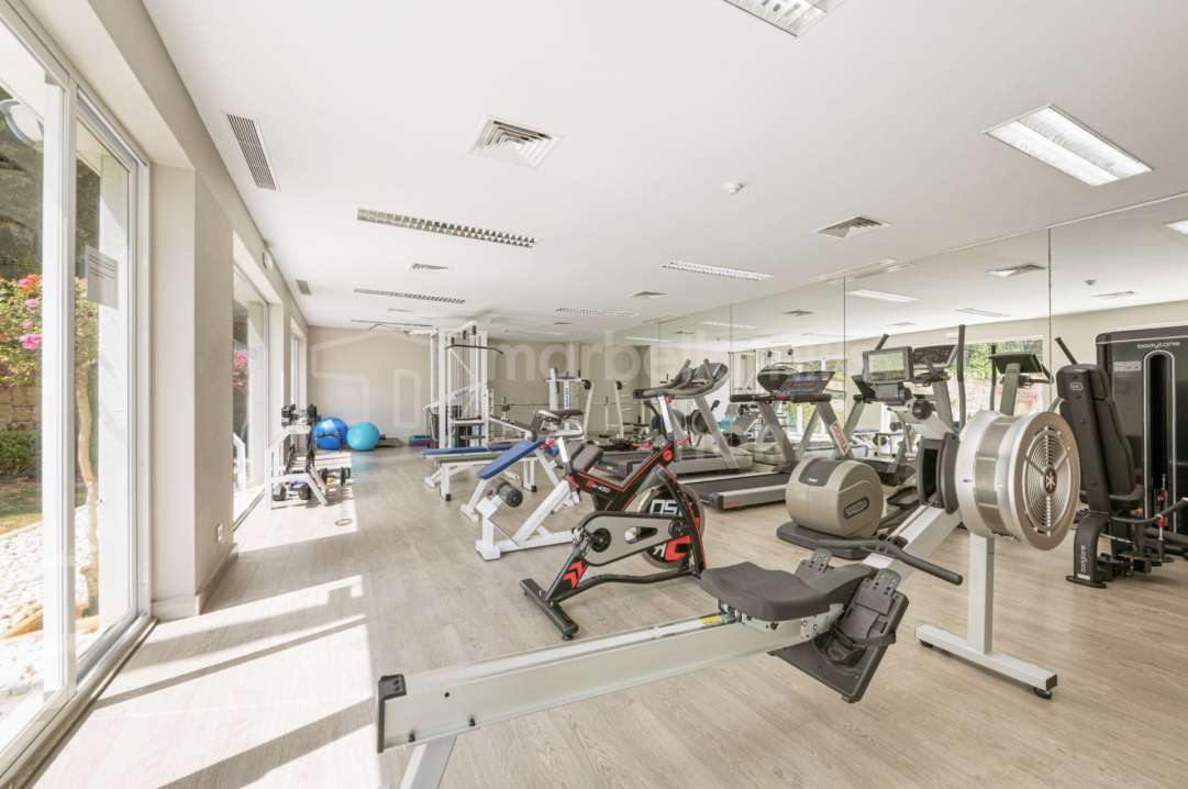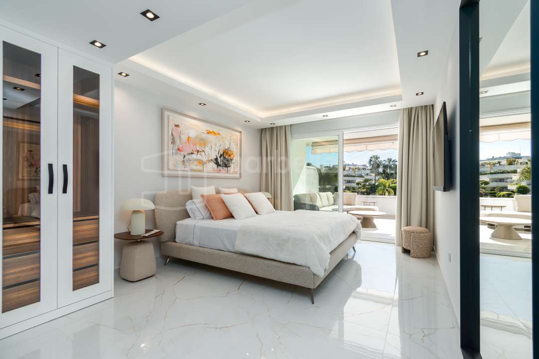 Appartement rénové de 3 chambres à Les Belvederes, La Cerquilla, Nueva Andalucía. 215 m² intérieurs, terrasse de 90 m² exposée sud, vue mer, sécurité 24h et prestations haut de...