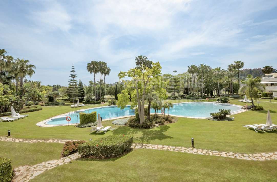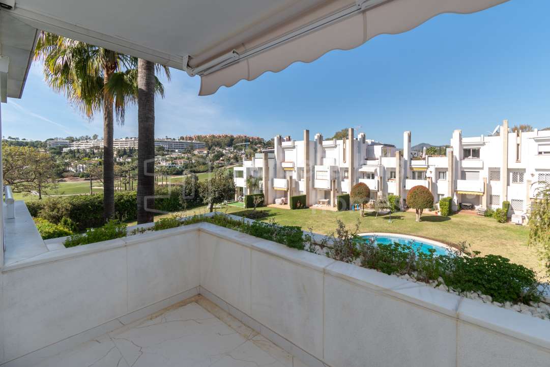Appartement rénové à Nueva Andalucía avec jardin privé, terrasse et vue mer. 3 chambres proche Puerto Banús et golf.