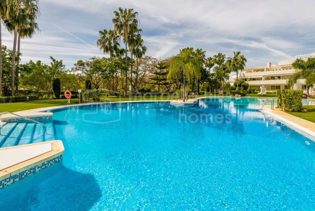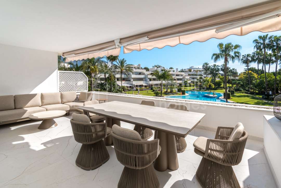 Appartement rénové 3 chambres à Nueva Andalucía avec grande terrasse, piscine, salle de sport et sécurité, proche Marbella.